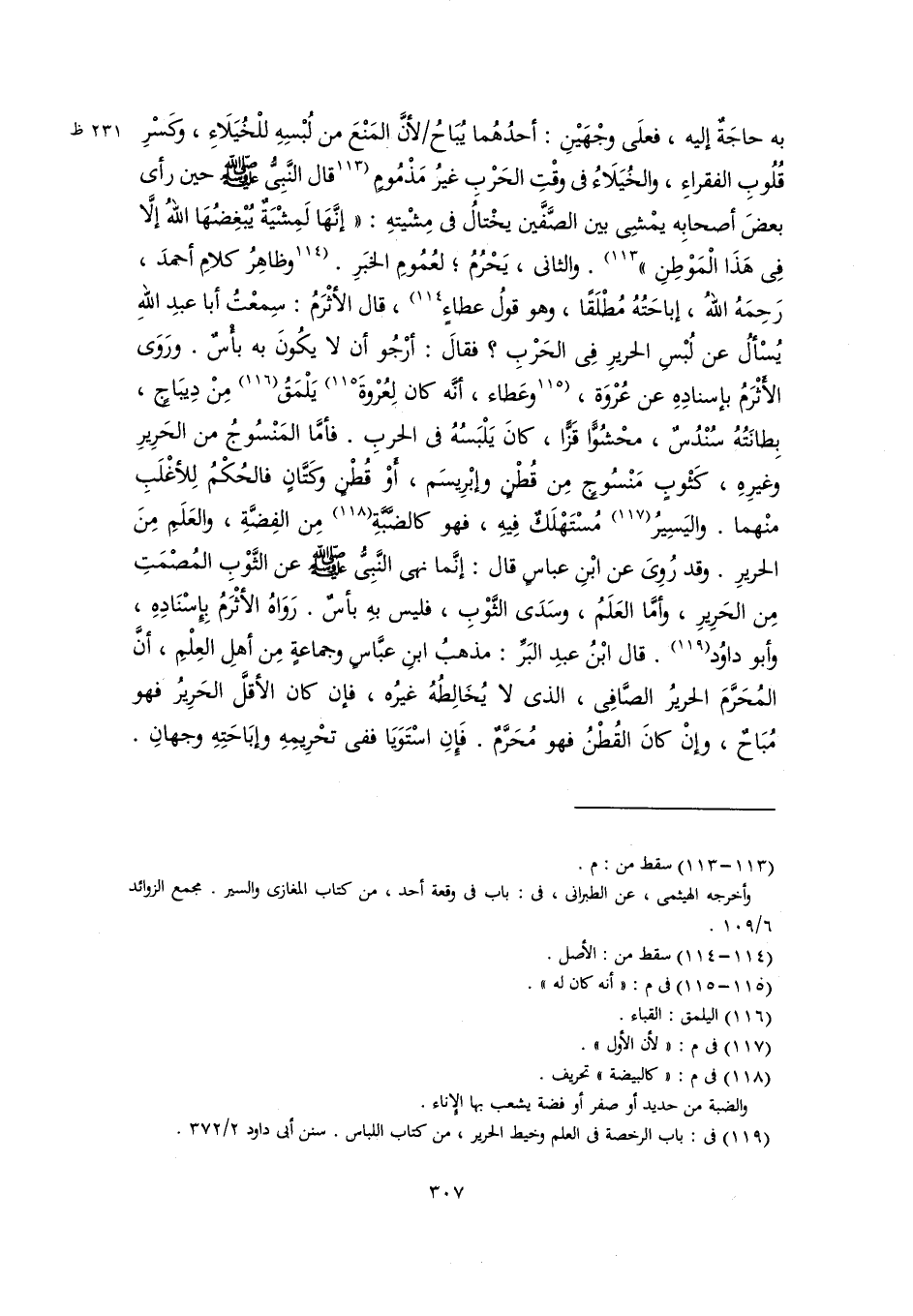 به حاجَةٌ إليه، فعلَى وجْهَيْنِ: أحدُهُما يُبَاحُ لأنَّ المَنْعَ من لُبْسِهِ للْخُيَلَاءِ، وكَسْرِ قُلُوبِ الفقراءِ، والخُيَلَاءُ في وقْتِ الحَرْبِ غيرُ مَذْمُومٍ [قال النَّبِىُّ -صلى اللَّه عليه وسلم- حين رأى بعضَ أصحابِه يمْشِى بين الصَّفَّين يخْتالُ في مِشْيتهِ: "إنَّهَا لَمِشْيَةٌ يُبْغِضُهَا اللهُ إلَّا فِي هَذَا الْمَوْطِنِ"] (١١٣). والثانى، يَحْرُمُ؛ لعُمُومِ الخبَرِ. [وظاهِرُ كلامِ أحمدَ، رَحِمَهُ اللهُ، إباحَتُهُ مُطْلَقًا، وهو قولُ عطاءٍ] (١١٤)، قال الأثْرَمُ: سِمعْتُ أبا عبدِ اللهِ يُسْألُ عن لُبْسِ الحريرِ في الحَرْبِ؟ فقالَ: أرْجُو أن لا يكُونَ به بأْسٌ. ورَوَى الأَثْرَمُ بإسنادِهِ عن عُرْوَة، [وعَطاء، أنَّه كان لِعُرْوةَ] (١١٥) يَلْمَقُ (١١٦) مِنْ دِيبَاجٍ، بِطانَتُهُ سُنْدُسٌ، محْشُوًّا قَزًّا، كانَ يَلْبَسُهُ في الحربِ. فأمَّا المَنْسُوجُ من الحَرِيرِ وغيرِهِ، كَثْوبٍ مَنْسُوجٍ مِن قُطْنٍ وإبْرِيسَم، أَوْ قُطْنٍ وكَتَّانٍ فالحُكْمُ لِلأغْلَبِ منْهما. واليَسِيرُ (١١٧) مُسْتَهْلَكٌ فِيهِ، فهو كالضَّبَّةِ (١١٨) مِن الفِضَّةِ، والعَلَمِ مِنَ الحريرِ. وقد رُوِىَ عن ابْنِ عبَّاسٍ قال: إنَّما نهى النَّبِىُّ -صلى اللَّه عليه وسلم- عن الثَّوْبِ المُصْمَتِ مِن الحَرِيرِ، وأمَّا العَلَمُ، وسَدَى الثَّوْبِ، فليس بهِ بأْسٌ. رَوَاهُ الأثْرَمُ بِإِسْنَادِهِ، وأبو داوُد (١١٩). قال ابْنُ عبدِ البَرِّ: مذهبُ ابنِ عبَّاسٍ وجماعةٍ مِن أهلِ العِلْمِ، أنَّ المُحَرَّمَ الحريرُ الصَّافِى، الذي لا يُخَالِطُهُ غيرُه، فإن كان الأقلَّ الحَرِيرُ فهو مُبَاحٌ، وإنْ كانَ القُطْنُ فهو مُحَرَّمٌ. فَإِنِ اسْتَوَيَا ففى تحْرِيمِهِ وإبَاحَتِهِ وجهانِ.