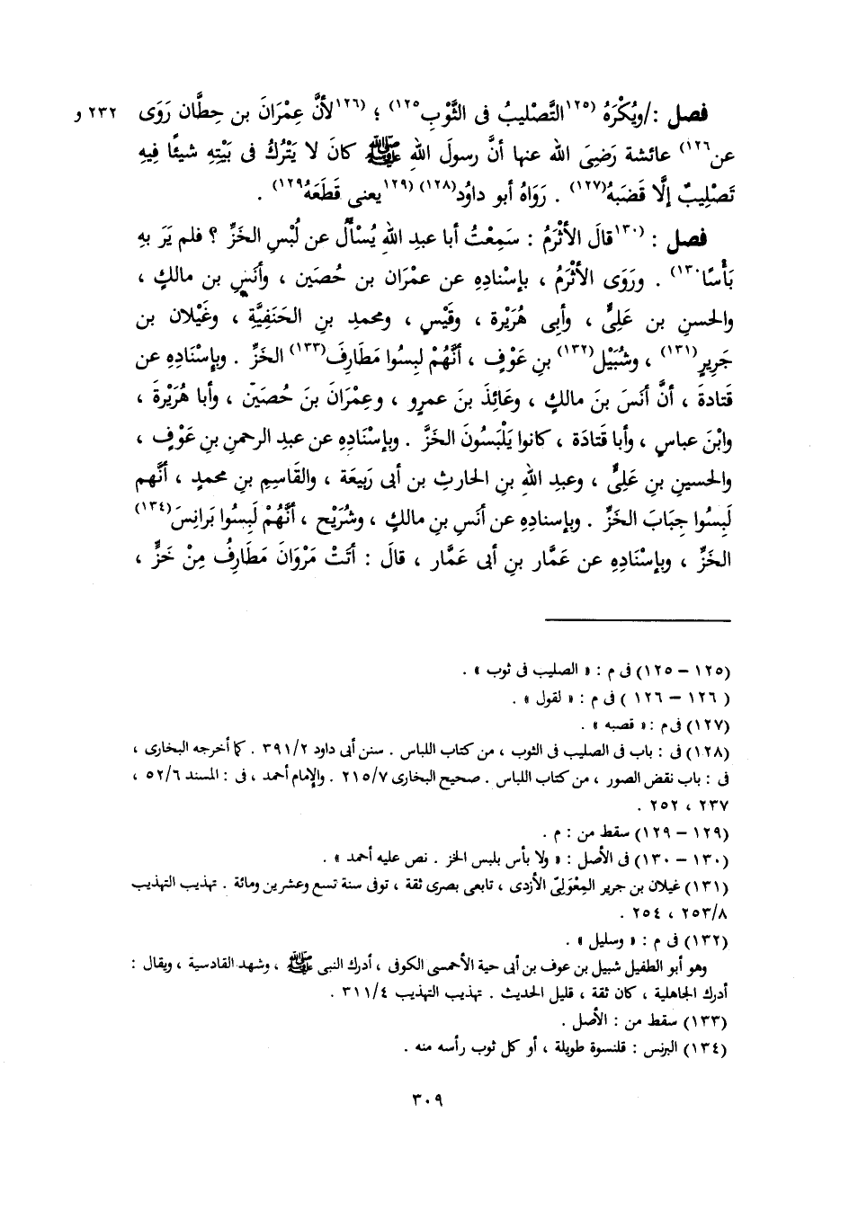 فصل: [قالَ الأثْرَمُ: سَمِعْتُ أبا عبدِ اللهِ يُسْأَلُ عن لُبْسِ الخَزِّ؟ فلم يَرَ بهِ بَأْسًا] (١٣٠). ورَوَى الأَثْرَمُ، بإسْنادِهِ عن عمْرَان بن حُصَين، وأنَسِ بن مالكٍ، والحسنِ بن عَلِىٍّ، وأبِى هُرَيْرة، وقَيْسٍ، ومحمدِ بنِ الحَنَفِيَّةِ، وغَيْلان بن جَرِيرٍ (١٣١)، وشُبَيْل (١٣٢) بنِ عَوْفٍ، أنَّهُمْ لبِسُوا مَطَارِفَ (١٣٣) الخَزِّ. وبإِسْنَادِهِ عن قَتادةَ، أنَّ أنَسَ بنَ مالكٍ، وعَائِذَ بنَ عمرٍو، وعِمْرَانَ بنَ حُصَين، وأبا هُرَيْرةَ، وابْنَ عبَّاسٍ، وأبا قَتادَة، كانوا يَلْبَسُونَ الخَزَّ. وبإسْنَادِهِ عن عبدِ الرحمنِ بنِ عَوْفٍ، والحسينِ بنِ عَلِىٍّ، وعبدِ اللهِ بنِ الحارثِ بن أبي رَبيعَة، والقَاسِمِ بنِ محمدٍ، أنَّهم لَبِسُوا جِبَابَ الخَزِّ. وبإسنادِهِ عن أنَسِ بنِ مالكٍ، وشُرَيْح، أنَّهُمْ لَبِسُوا بَرانِسَ (١٣٤) الخَزِّ، وبإسْنَادِهِ عن عَمَّار بنِ أبي عَمَّار، قالَ: أتَتْ مَرْوَانَ مَطَارِفُ مِنْ خَزٍّ،