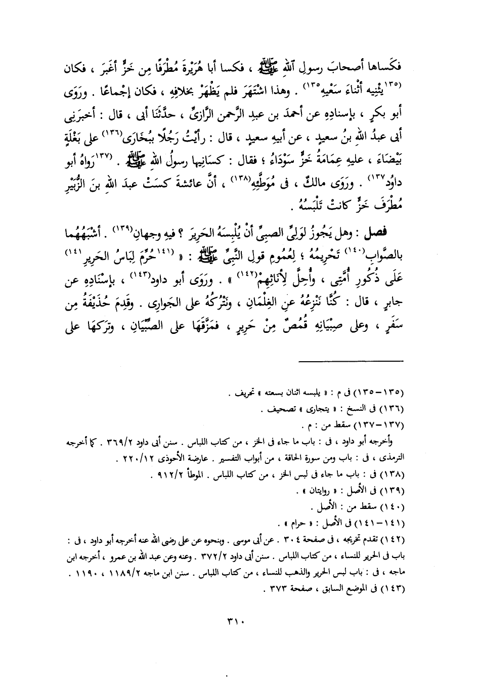 فصل: وهل يَجُوزُ لوَلِىِّ الصبِىِّ أنْ يُلْبِسَهُ الحَرِيرَ؟ فيهِ وجهانِ (١٣٩). أشْبَهُهُما بالصَّوابِ (١٤٠) تَحْرِيمُهُ؛ لِعُمُومِ قولِ النَّبِيِّ -صلى اللَّه عليه وسلم-: " [حُرِّمَ لِبَاسُ الحَرِيرِ] (١٤١) عَلَى ذُكُورِ أُمَّتِى، وأُحِلَّ لإِنَاثِهِمْ (١٤٢) ". ورَوَى أبو داود (١٤٣)، بإسْنَادِهِ عن جابرٍ، قال: كُنَّا نَنْزِعُهُ عنِ الغِلْمَانِ، ونَتْرُكُهُ على الجَوارِى. وقَدِمَ حُذَيْفَةُ مِن سَفَرٍ، وعلى صِبْيَانِهِ قُمُصٌ مِنْ حَرِيرٍ، فمَزَّقَهَا على الصِّبْيَانِ، وترَكهَا على