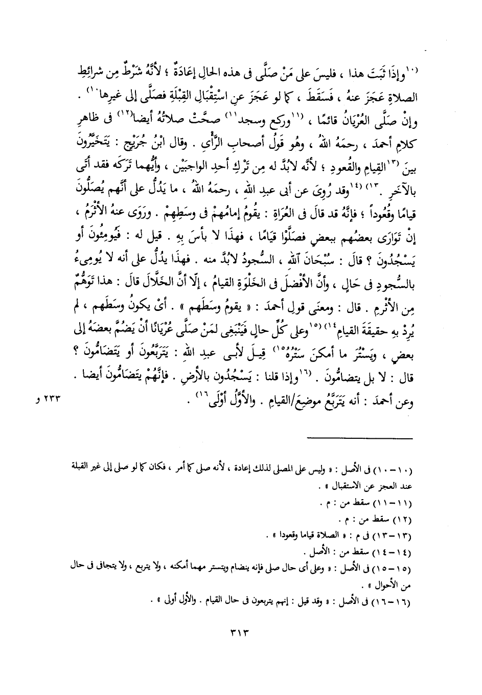 [وإذَا ثَبَتَ هذا، فليسَ على مَنْ صَلَّى في هذه الحالِ إعَادَةٌ؛ لأنَّهُ شَرْطٌ مِن شرائِطِ الصلاةِ عَجَزَ عنهُ، فَسَقَطَ، كما لو عَجَزَ عنِ اسْتِقْبَالِ القِبْلَةِ فصَلَّى إلى غيرِها] (١٠). وإنْ صَلَّى العُرْيَانُ قائمًا، [وركع وسجد] (١١) صحَّتْ صلاتُهُ أيضًا (١٢) في ظاهرِ كلامِ أحمدَ، رحمَهُ اللهُ، وهُو قَولُ أصحابِ الرَّأْىِ. وقال ابْنُ جُرَيْجٍ: يَتَخَيَّرُونَ بينَ [القِيامِ والقُعودِ؛ لأنَّه لا بُدَّ له مِن تَرْكِ أحدِ الواجبَيْن، وأيُّهما تَرَكَه فقد أتَى بالآخَرِ.] (١٣) [وقد رُوِىَ عن أبي عبدِ اللهِ، رحمَهُ اللهُ، ما يَدُلُّ على أنَّهم يُصَلُّونَ قِيامًا وقُعُودًا؛ فإنَّهُ قد قالَ في العُرَاةِ: يقُومُ إمامُهمْ في وسَطِهِمْ. ورَوَى عنهُ الأثْرَمُ، إنْ تَوَارَى بعضُهم ببعضٍ فصَلَّوْا قيَامًا، فهذَا لا بأسَ بِهِ. قيل له: فَيُومِئُونَ أو يَسْجُدُونَ؟ قالَ: سُبْحَانَ اللهِ، السُّجُودُ لا بُدَّ منه. فهذَا يدُلُّ على أنه لا يُومِىءُ بالسُّجودِ في حَالٍ، وأنَّ الأفْضلَ في الخَلْوَةِ القيامُ، إلَّا أنَّ الخَلَّالَ قالَ: هذا تَوَهُّمٌ مِن الأثْرمِ. قال: ومعنَى قولِ أحمدَ: "يقومُ وسَطَهم". أىْ يكونُ وسَطَهم، لم يُرِدْ بهِ حقيقَةَ القيامِ] (١٤) [وعلى كُلِّ حالٍ فَيَنْبَغِى لمَنْ صَلَّى عُرْيَانًا أنْ يَضُمَّ بعضَهُ إلى بعضٍ، ويَسْتُرَ ما أمكنَ سَتْرُهُ] (١٥) قِيلَ لأبي عبدِ اللهِ: يَتَرَبَّعُونَ أو يَتَضَامُّونَ؟ قال: لا بل يتضامُّونَ. [وإذا قلنا: يَسْجُدُون بالأرضِ. فإنَّهُمْ يتَضَامُّونَ أيضًا. وعن أحمدَ: أنه يَتَرَبَّعُ موضِعَ القيامِ. والأوَّلُ أوْلَى] (١٦).
