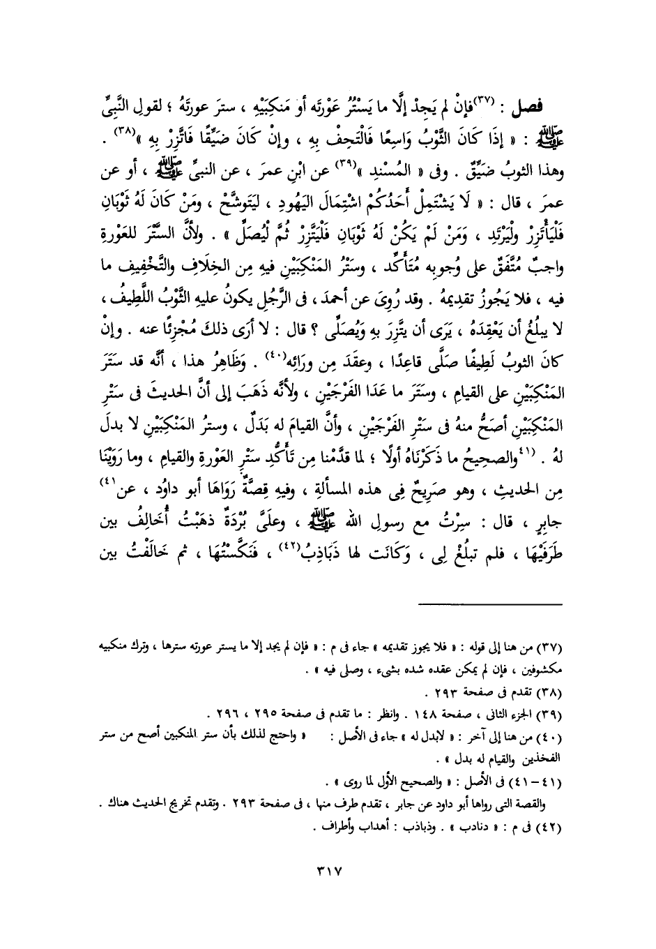 فصل: (٣٧) فإنْ لم يَجِدْ إلَّا ما يَسْتُرُ عَوْرتَه أو مَنكِبَيْهِ، سترَ عورَتهُ؛ لقولِ النَّبِيِّ -صلى اللَّه عليه وسلم-: "إذَا كَانَ الثَّوْبُ وَاسِعًا فَالْتَحِفْ بِهِ، وإنْ كَانَ ضَيِّقًا فَاتَّزِرْ بهِ" (٣٨). وهذا الثوبُ ضَيِّقٌ. وفى "المُسْندِ" (٣٩) عن ابْنِ عمرَ، عن النبيِّ -صلى اللَّه عليه وسلم-، أو عن عمرَ، قال: "لَا يَشْتَمِلْ أَحَدُكُمْ اشْتِمَالَ اليَهُودِ، ليَتَوشَّحْ، ومَنْ كَانَ لَهُ ثَوْبَانِ فَلْيَأْتَزِرْ ولْيَرْتَدِ، وَمَنْ لَمْ يَكُنْ لَهُ ثَوْبَانِ فَلْيَتَّزِرْ ثُمَّ لْيُصَلِّ". ولأنَّ السَّتْرَ للعَوْرةِ واجبٌ مُتَّفَقٌ على وُجوبِه مُتَأَكِّد، وسَتْرُ المَنْكِبَيْنِ فيهِ مِن الخِلَافِ والتَّخْفِيفِ ما فيه، فلا يَجُوزُ تقدِيمهُ. وقد رُوِىَ عن أحمدَ، في الرَّجُلِ يكونُ عليهِ الثَّوْبُ اللَّطِيفُ، لا يبلُغُ أن يَعْقِدَهُ، يَرَى أن يتَّزِرَ بهِ وَيُصَلِّى؟ قال: لا أرَى ذلكَ مُجْزِئًا عنه. وإنْ كانَ الثوبُ لَطِيفًا صَلَّى قاعِدًا، وعقَدَ مِن ورَائِه (٤٠). وَظَاهِرُ هذا، أنَّه قد سَتَرَ المَنْكِبَيْنِ على القيامِ، وسَتَرَ ما عَدَا الفَرْجَيْنِ، ولأنَّه ذَهَبَ إلى أنَّ الحديثَ في سَتْرِ المَنْكبَيْنِ أصَحُّ منهُ في سَتْرِ الفَرْجَيْنِ، وأنَّ القيامَ له بَدَلٌ، وسترُ المَنْكِبَيْنِ لا بدلَ لهُ. [والصحِيحُ ما ذَكَرْنَاهُ أولًا؛ لما قدَّمْنا مِن تَأَكُّدِ سَتْرِ العَوْرةِ والقيامِ، وما رَوَيْنَا مِن الحديثِ، وهو صَرِيحٌ فِي هذه المسألةِ، وفيهِ قِصَّةٌ رَوَاهَا أبو داوُد، عن] (٤١) جابِرٍ، قال: سِرْتُ مع رسولِ اللَّه -صلى اللَّه عليه وسلم-، وعلَىَّ بُرْدَةٌ ذهَبْتُ أُخَالِفُ بين طَرَفَيْهَا، فلم تبلُغْ لِى، وَكَانَت لها ذَبَاذِبُ (٤٢)، فَنَكَّسْتُهَا، ثم خَالَفْتُ بين