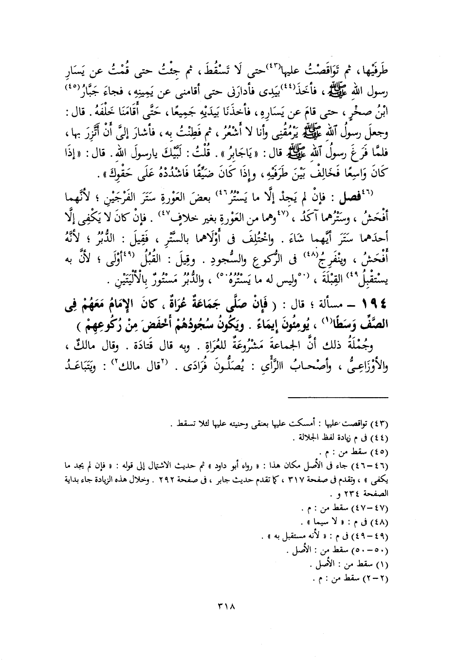 طَرفَيْها، ثم تَوَاقَصْتُ عليها (٤٣) حتى لَا تَسْقُطَ، ثم جِئْتُ حتَّى قُمْتُ عن يَسَارِ رسول اللهِ -صلى اللَّه عليه وسلم-، فأخَذَ (٤٤) بيَدِى فأدارَنى حتى أقامنى عن يَمِينِهِ، فجاءَ جَبَّارُ (٤٥) ابْنُ صخْرٍ، حتَّى قامَ عن يَسَارِهِ، فأخذَنَا بَيدَيْهِ جَمِيعًا، حَتَّى أقَامَنَا خَلْفَهُ. قال: وجعلَ رسولُ اللهِ -صلى اللَّه عليه وسلم- يَرْمُقُنِى وأنا لا أَشْعُرُ، ثم فَطِنْتُ بِه، فأشارَ إلىَّ أَنْ أَتَّزِرَ بها، فلمَّا فرَغَ رسولُ اللهِ -صلى اللَّه عليه وسلم- قال: "يَا جَابِرُ". قُلْتُ: لَبَّيْكَ يا رسولَ اللهِ. قال: "إذَا كَانَ وَاسِعًا فَخَالِفْ بَيْنَ طَرَفَيْهِ، وإِذَا كَانَ ضَيِّقًا فَاشْدُدْهُ عَلَى حَقْوِكَ".