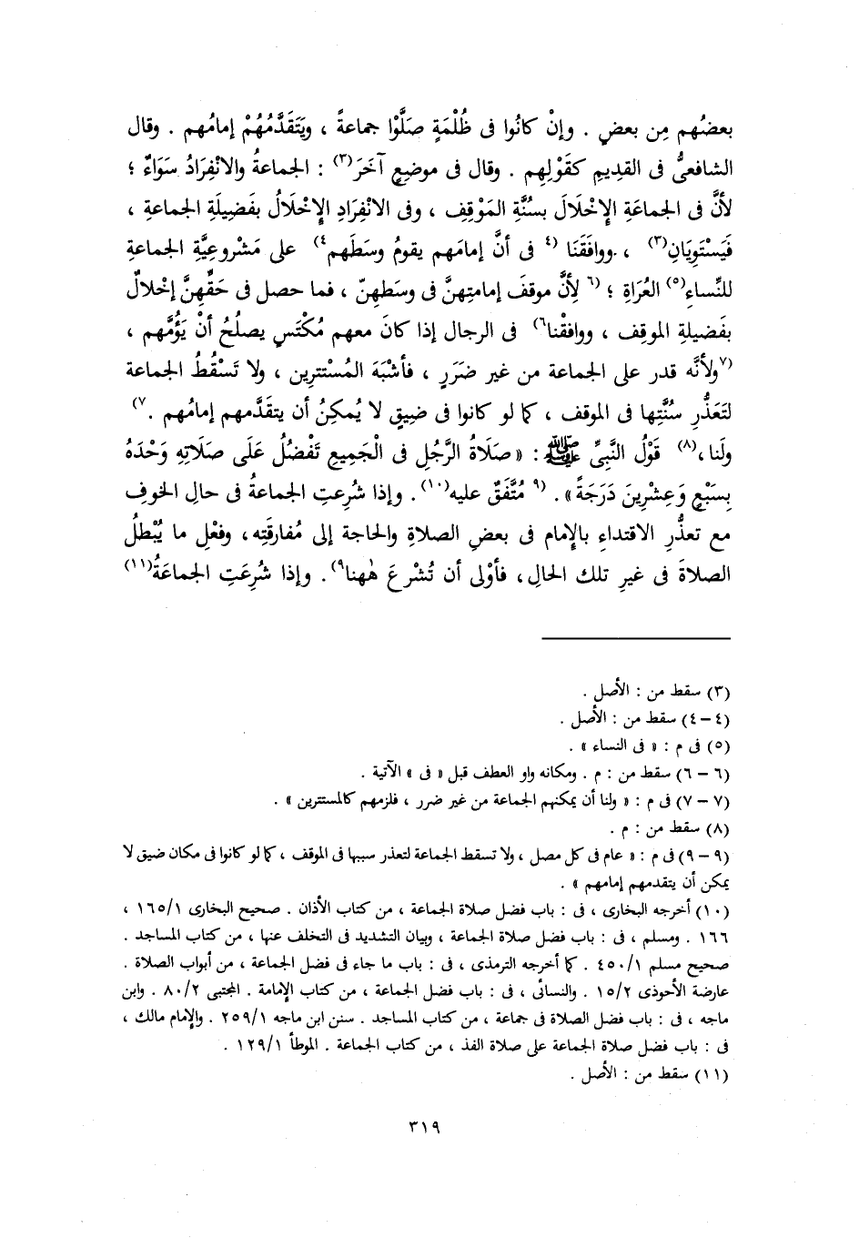 (١٠) في م: "عام في كل مصل، ولا تسقط الجماعة لتعذر سببها في الموقف، كما لو كانوا في مكان ضيق لا يمكن أن يتقدمهم إمامهم".