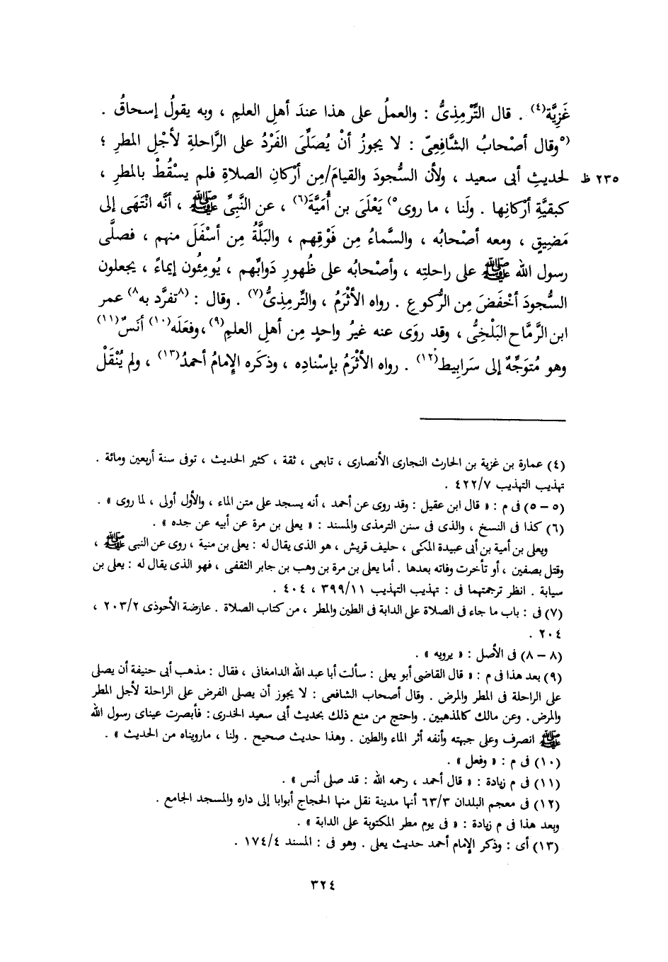 (٩) بعد هذا في م: "قال القاضي أبو يعلى: سألت أبا عبد اللَّه الدامغاني، فقال: مذهب أبى حنيفة أن يصلى على الراحلة في المطر والمرض. وقال أصحاب الشافعي: لا يجوز أن يصلى الفرض على الراحلة لأجل المطر والمرض. وعن مالك كالمذهبين. واحتج من منع ذلك بحديث أبى سعيد الخدري: فأبصرت عيناى رسول اللَّه -صلى اللَّه عليه وسلم- انصرف وعلى جبهته وأنفه أثر الماء والطين. وهذا حديث صحيح. ولنا، ما رويناه من الحديث".