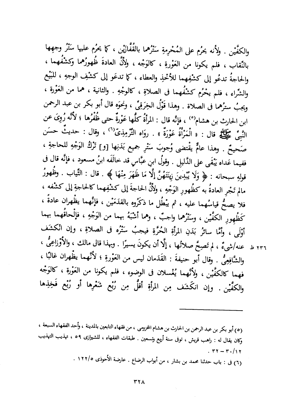 والكفَّيْن. ولأنه يحرُم على المُحْرِمةِ سَتْرُهما بالقُفَّازَيْن، كما يحرُم عليها سَتْرُ وجهِها بالنِّقاب، فلم يكونا من العَوْرةِ، كالوَجْه، ولأنَّ العادةَ ظُهورُهما وكشْفُهما، والحاجةُ تدعُو إلى كشْفِهما للأخْذِ والعطاء، كما تدعَو إلى كشْفِ الوجهِ، للبَيْع والشِّراء، فلم يحْرُم كشْفُهما في الصلاةِ، كالوجْهِ. والثانية، هما من العَوْرة، ويجبُ سترُهما في الصلاة. وهذا قَوْلُ الخِرَقِىِّ، ونحوَه قال أبو بكر بن عبد الرحمن بن الحارث بن هشام (٥)، فإنَّه قال: المرأةُ كلُّها عَوْرةٌ حتى ظُفْرُها؛ لأنَّه رُوِىَ عن النَّبِيِّ -صلى اللَّه عليه وسلم- قال: "الْمَرْأَةُ عَوْرَةٌ". روَاه التِّرمِذِىّ (٦)، وقال: حديثٌ حسَن صَحيحٌ. وهذا عامٌّ يقْتضى وُجوبَ سَتْرِ جميع بَدَنِها [و] تَرْكُ الوَجْهِ للحاجةِ، ففيما عَداه يَبْقَى على الدَّليلِ. وقولُ ابنِ عبَّاسٍ قد خالَفَه ابنُ مسعود، فإنَّه قال في قولهِ سبحانه: {وَلَا يُبْدِينَ زِينَتَهُنَّ إِلَّا مَا ظَهَرَ مِنْهَا}. قال: الثِّياب. وظُهورُ ما لم تَجْرِ العادةُ به كظُهورِ الوَجْهِ، ولأنَّ الحاجةَ إلى كشْفِهما كالحاجةِ إلى كشْفه، فلا يصحُّ قياسُهما عليه، ثم يبْطُل ما ذكَرُوه بالقدَمَيْن، فإنَّهما يظْهران عادةً، كَظُهورِ الكفَّيْن، وسَتْرُهما واجبٌ، وهما أشْبَهُ بهما من الوَجْهِ، فإلْحاقُهما بهما أوْلَى، وأمَّا سائرُ بَدَنِ المرأةِ الحُرَّةِ فيجبُ سَتْرُه في الصلاةِ، وإن انْكشَف عنه شيءٌ، لم تَصِحَّ صلاتُها، إلَّا أن يكونَ يسيرًا. وبهذا قال مالك، والأوْزاعِىُّ، والشَّافِعِىُّ. وقال أبو حنيفةَ: القَدَمان ليس من العَوْرةِ؛ لأنَّهما يظْهران غالبًا، فهما كالكفَّيْن، ولأنَّهما يُغْسلان في الوضوء، فلم يكونا من العَوْرة، كالوَجْه والكفَّيْن. وإن انكَشَف مِن المرأةِ أقلُّ مِن رُبْع شَعْرِها أو رُبْع فَخِذِها