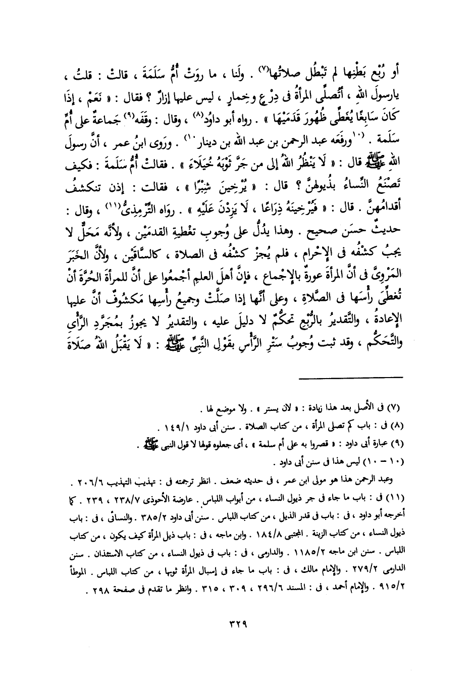 أو رُبْع بَطْنِها لم تَبْطُل صلاتُها (٧). ولَنا، ما روَتْ أُمُّ سَلَمَةَ، قالتْ: قلتُ، يا رسولَ اللهِ، أتُصلِّي المرأةُ في دِرْعٍ وخِمارٍ، ليس عليها إزارٌ؟ فقال: "نَعَمْ، إذَا كَانَ سَابِغًا يُغَطِّى ظُهُورَ قَدَمَيْهَا". رواه أبو داوُد (٨)، وقال: وقَفَه (٩) جَماعةٌ على أُمِّ سَلَمة. [ورفَعَه عبد الرحمن بن عبد اللَّه بن دينار] (١٠). ورَوى ابنُ عمر، أنَّ رسولَ اللهِ -صلى اللَّه عليه وسلم- قال: "لَا يَنْظُرُ اللهُ إلى من جَرَّ ثَوْبَهُ خُيَلَاءَ". فقالتْ أُمُّ سَلَمةَ: فكيف تَصْنَعُ النِّساءُ بذُيولهنَّ؟ قال: "يُرْخِينَ شِبْرًا"، فقالت: إذن تنكشفُ أقدامُهنَّ. قال: "فيرْخِينَهُ ذِرَاعًا، لَا يَزِدْنَ عَلَيْهِ". روَاه التِّرمِذِىُّ (١١)، وقال: حديثٌ حسَن صحيح. وهذا يدُلُّ على وُجوبِ تغْطيةِ القدمَيْن، ولأنَّه مَحَلٌّ لا يجبُ كشْفُه في الإِحْرام، فلم يُجزْ كشْفُه في الصلاة، كالسَّاقَيْن، ولأنَّ الخَبَرَ المَرْوِيَّ في أنَّ المرأةَ عورةٌ بالإِجْماع، فإنَّ أهلَ العلمِ أجْمعُوا على أنَّ للمرأةَ الحُرَّةَ أنْ تُغطِّىَ رأْسَها في الصَّلاةِ، وعلى أنَّها إذا صَلَّتْ وجميعُ رأْسِها مَكشُوفٌ أنَّ عليها الإِعادةُ، والتَّقديرُ بالرُّبعِ تحكُّمٌ لا دليلَ عليه، والتقديرُ لا يجوزُ بمُجَرَّدِ الرَّأْىِ والتَّحَكُّم، وقد ثبت وُجوبُ سَتْرِ الرَّأْسِ بقَوْلِ النَّبِيِّ -صلى اللَّه عليه وسلم-: "لَا يَقْبَلُ اللهُ صَلَاةَ