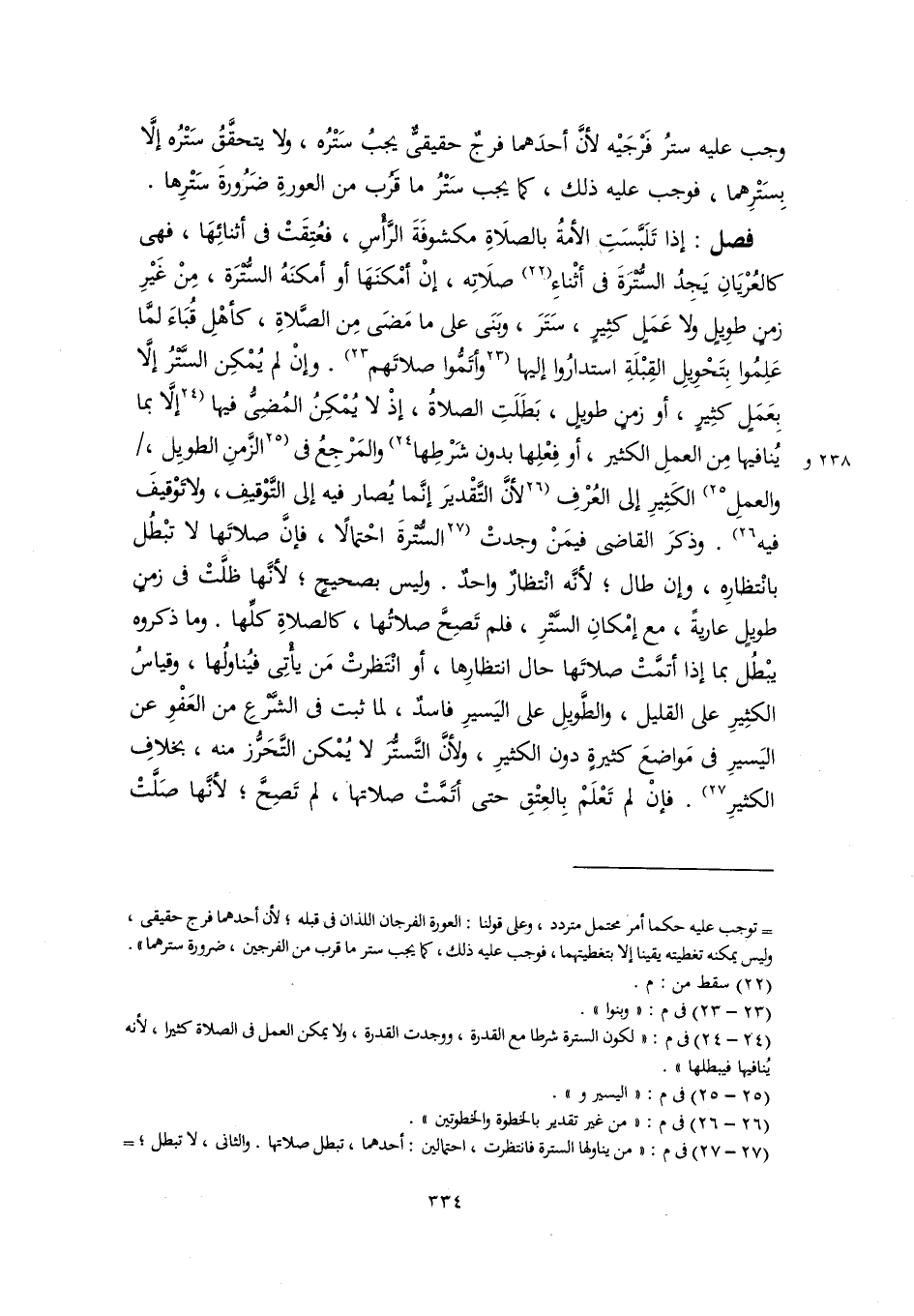 فصل: إذا تَلَبَّسَتِ الأمةُ بالصلَاةِ مكشوفَةَ الرَّأْسِ، فعُتِقَتْ في أثنائِهَا، فهى كالعُريَانِ يَجِدُ السُّتْرَةَ في أثْناءِ (٢٢) صلَاتِه، إنْ أمْكنَهَا أو أمكنَهُ السُّتْرَة، مِنْ غَيْرِ زمنٍ طوِيلٍ ولا عَمَلٍ كثِيرٍ، سَتَرَ، وبَنَى على ما مَضَى مِن الصَّلاةِ، كأهْلِ قُبَاءَ لمَّا عَلِمُوا بِتَحْوِيلِ القِبْلَةِ استدارُوا إليها [وأتَمُّوا صلاتَهم] (٢٣). وإنْ لم يُمْكِن السَّيْرُ إلَّا بِعَمَلٍ كثِيرٍ، أو زمنٍ طويلٍ، بَطَلَتِ الصلاةُ، إذْ لا يُمْكِنُ المُضِىُّ فيها [إلَّا بما يُنافيها مِن العملِ الكثير، أو فِعْلِها بدون شَرْطِها] (٢٤) والمَرْجِعُ في [الزَّمنِ الطويلِ، والعملِ] (٢٥) الكَثِيرِ إلى العُرْفِ [لأنَّ التَّقْديرَ إنَّما يُصار فيه إلى التَّوْقيفِ، ولا تَوْقيفَ فيه] (٢٦). وذكرَ القاضي فيمَنْ وجدتْ [السُّتْرةَ احْتمالًا، فإنَّ صلاتَها لا تبْطُل بانْتظارِه، وإن طال؛ لأنَّه انْتظارٌ واحدٌ. وليس بصحيحٍ؛ لأنَّها ظلَّتْ في زمنٍ طويلٍ عاريةً، مع إمْكانِ السَّتْرِ، فلم تَصِحَّ صلاتُها، كالصلاةِ كلِّها. وما ذكروه يبْطُل بما إذا أتمَّتْ صلاتَها حال انتظارِها، أو انْتَظرتْ مَن يأْتِى فيُناولُها، وقياسُ الكثِيرِ على القليل، والطَّويلِ على اليَسيرِ فاسدٌ، لما ثبت في الشَّرْعِ من العَفْوِ عن اليَسيرِ في مَواضعَ كثيرةٍ دون الكثيرِ، ولأنَّ التَّستُّرَ لا يُمْكن التَّحَرُّز منه، بخلافِ الكثيرِ] (٢٧). فإنْ لم تَعْلَمْ بِالعِتْقِ حتى أتَمَّتْ صلاتها، لم تَصِحَّ؛ لأنَّها صَلَّتْ