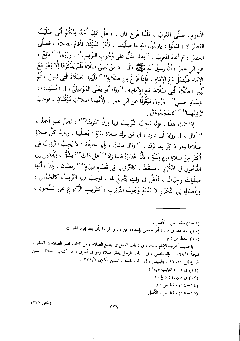 الأحزابِ صَلَّى المغْرِبَ، فلَمَّا فَرَغَ قال: "هَلْ عَلِمَ أَحَدٌ مِنْكُمْ أَنِّى صَلَّيْتُ العَصْرَ؟ " فقالُوا: يا رسُولَ اللهِ ما صلَّيْتَها. فأَمَرَ المُؤَذِّنَ فأقامَ الصلاةَ، فصلَّى العصرَ، ثم أعادَ المغرِبَ. [وهذا يدُلُّ عَلَى وُجُوبِ الترْتِيبِ] (٩). ورَوَى (١٠) نَافِعٌ، عنِ ابْنِ عمرَ، أنَّ رسولَ اللهِ -صلى اللَّه عليه وسلم- قالَ: "مَنْ نَسِىَ صَلَاةً فَلَمْ يَذْكُرْهَا إلَّا وَهُوَ مَعَ الإِمَامَ فَلْيُصَلِّ مَعَ الإِمَامَ، فَإِذَا فَرَغَ مِن صَلَاتِهِ (١١) فَلْيُعِدِ الصَّلَاةَ الَّتِى نَسِىَ، ثُمَّ لْيُعِدِ الصَّلَّاةَ الَّتِى صَلَّاهَا مَعَ الإِمَامِ". [روَاه أبو يَعْلَى المَوْصِلِىُّ، في "مُسْنَده"، بإسْنادٍ حسنٍ] (٩). وَرُوِىَ مَوْقُوفًا عن ابْنِ عمر. ولأنَّهما صلاتَانِ مُؤَقَّتَتَانِ، فوجبَ تَرْتِيبُهما (١٢) كالمَجْمُوعَتَيْنِ.