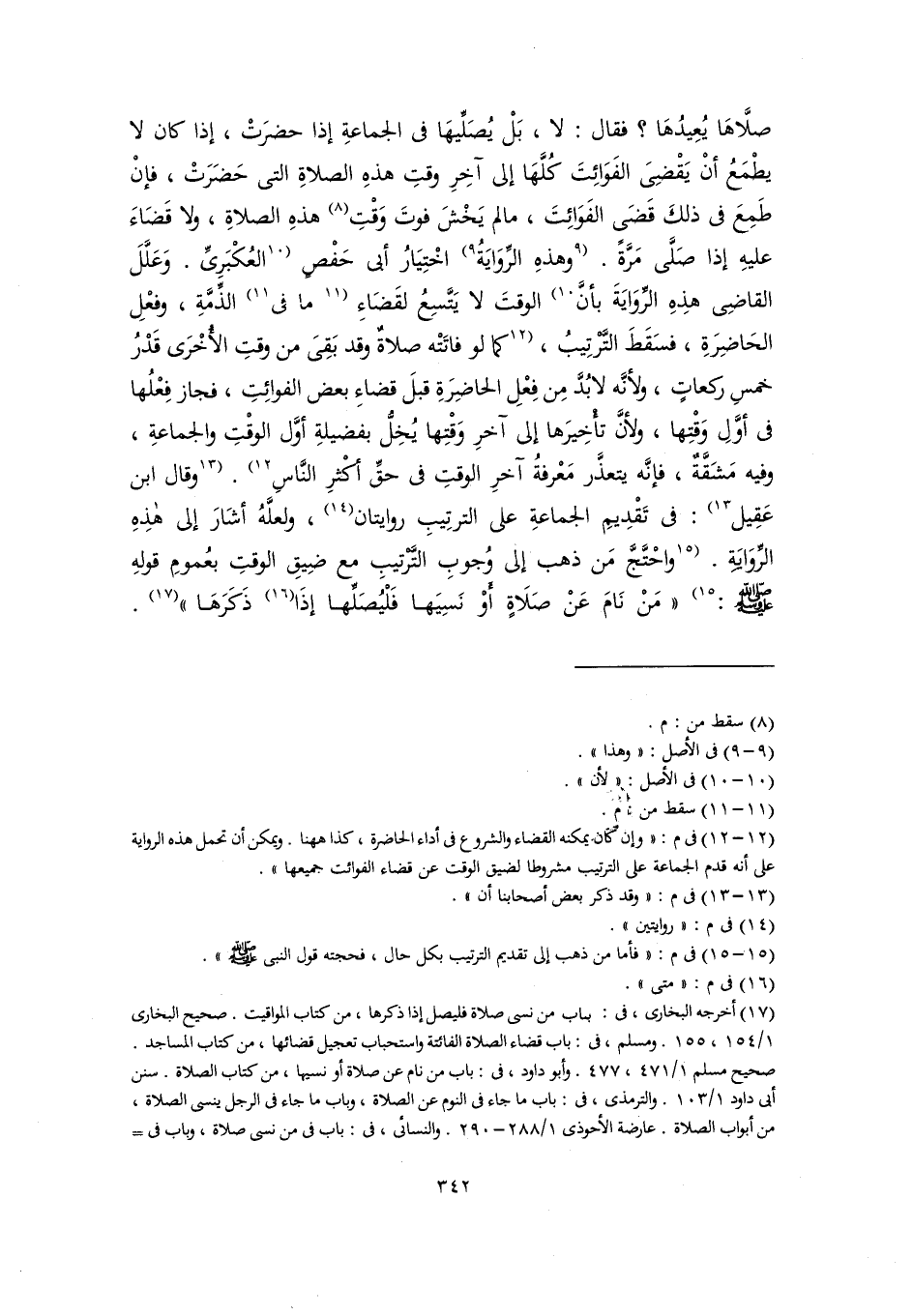 صلَّاهَا يُعِيدُهَا؟ فقال: لا، بَلْ يُصَلِّيهَا في الجماعةِ إذا حضرَتْ، إذا كان لا يطْمَعُ أنْ يَقْضِىَ الفَوَائِتَ كُلَّهَا إلى آخِرِ وقتِ هذهِ الصلاةِ التي حَضَرَتْ، فإنْ طَمِعَ في ذلكَ قَضَى الفَوَائِتَ، ما لم يَخْشَ فوتَ وَقْتِ (٨) هذهِ الصلاةِ، ولا قَضَاءَ عليهِ إذا صَلَّى مَرَّةً. [وهذهِ الرِّوَايَةُ] (٩) اخْتِيَارُ أبي حَفْصٍ [العُكْبَرِىِّ. وَعَلَّلَ القاضِى هذِهِ الرِّوَايَةَ بأنَّ] (١٠) الوقتَ لا يَتَّسِعُ لقَضَاءِ [ما في] (١١) الذِّمَّةِ، وفعْلِ الحَاضِرَةِ، فسَقَطَ التَّرْتِيبُ، [لو فاتَتْه صلاةٌ وقد بَقِىَ من وقتِ الأُخْرَى قَدْرُ خمسِ ركعاتٍ، ولأنَّه لا بُدَّ مِن فِعْلِ الحاضِرَةِ قبلَ قضاءِ بعض الفوائِتِ، فجاز فِعْلُها في أوَّلِ وَقْتِها، ولأنَّ تأْخِيرَها إلى آخرِ وَقْتِها يُخِلُّ بفضيلةِ أوَّل الوقْتِ والجماعةِ، وفيه مَشَقَّةٌ، فإنَّه يتعذَّر مَعْرفةُ آخرِ الوقتِ في حقِّ أكْثرِ النَّاسِ] (١٢). [وقال ابن عَقِيل] (١٣): في تَقْدِيمِ الجماعةِ على الترتِيبِ روايتان (١٤)، ولعلَّهُ أشَارَ إلى هذِهِ الرِّوَايَةِ. [واحْتَّجَّ مَن ذهب إلى وُجوبِ التَّرْتيبِ مع ضِيقِ الوقتِ بعُمومِ قولهِ -صلى اللَّه عليه وسلم-: ] (١٥) "مَنْ نَامَ عَنْ صَلَاةٍ أَوْ نَسِيَها فَلْيُصَلِّها إذَا (١٦) ذَكَرَهَا" (١٧)