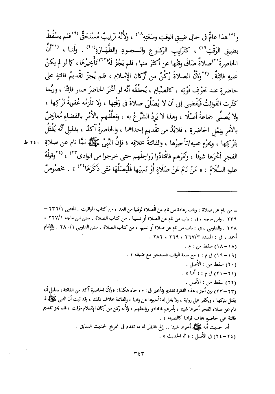و [هذا عامٌّ في حالِ ضِيقِ الوقتِ وسَعَتِهِ] (١٨)، ولأَنَّهُ تَرْتِيبٌ مُسْتَحَقٌّ [فلم يسْقُطْ بضِيقِ الوَقْتِ] (١٩)، كتَرْتِيبِ الركوعِ والسجودِ والطَّهَارَةِ (٢٠). ولَنا، [أنَّ الحاضِرةَ] (٢١) صلاةٌ ضَاقَ وقتُها عن أكثَرَ منها، فلم يَجُزْ لَهُ (٢٢) تَأْخِيرُهَا، كما لو لم يكنْ عليهِ فائِتَةٌ. [ولأنَّ الصلاةَ رُكْنٌ من أرْكان الإِسلام، فلم يُجزْ تقْديمُ فائتةٍ على حاضرةٍ عند خَوْفِ فَوْتِه، كالصِّيامِ، يُحقِّقُه أنَّه لو أخَّرَ الحاضرَ صار فائِتًا، وربَّما كثُرت الفَوائِتُ فَيُفْضِى إلى أن لا يُصَلِّىَ صلاةً في وَقْتِها، ولا تلْزمُه عُقوبةُ تَرْكِها، ولا يُصلِّى جماعةً أصْلًا، وهذا لا يَرِدُ الشَّرْعُ به، وتعلُّقُهم بالأمْرِ بالقضاءِ مُعارَضٌ بالأمرِ بفِعْلِ الحاضرةِ، فلا بُدَّ من تقْديمِ إحداهما، والحاضرةُ آكدُ، بدليلِ أنَّه يُقْتَلُ بتَرْكِها، ويحرُم عليه تأخيرُها، والفائِتَةُ بخلافِه؛ فإنَّ النَّبِيِّ -صلى اللَّه عليه وسلم- لمَّا نام عن صلاةِ الفجرِ أخَّرَها شيئًا، وأمَرَهم فاقْتادُوا رَواحِلَهم حتى خرجوا من الوادى] (٢٣)، [وقولُهُ عليهِ السَّلَامُ: "مَنْ نَامَ عَنْ صَلَاةٍ أَوْ نَسِيَها فَلْيُصَلِّهَا مَتَى ذَكَرَهَا] (٢٤) ". مخصُوصٌ