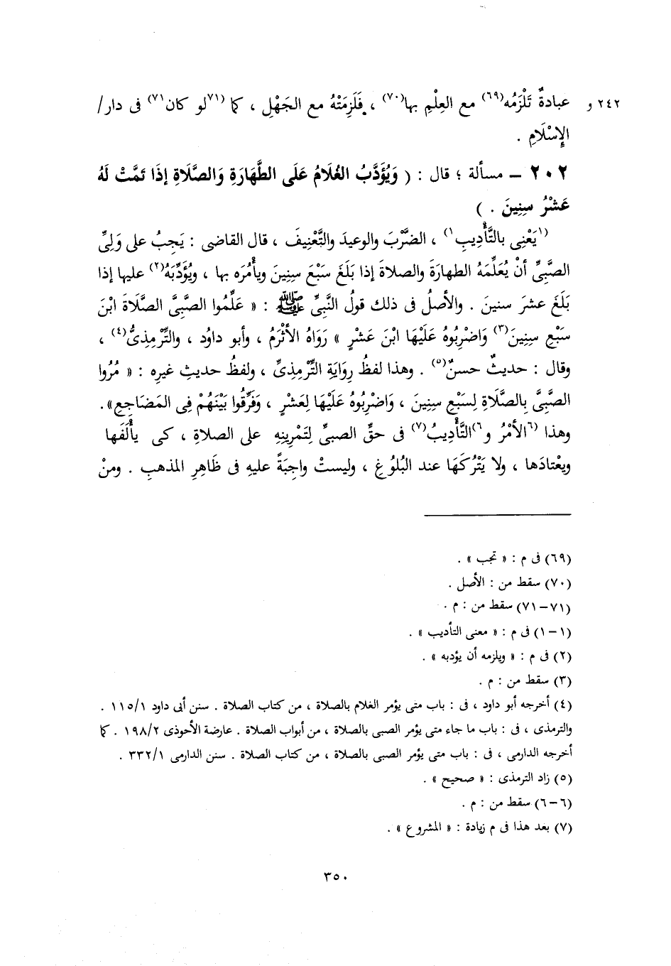 ٢٠٢ - مسألة؛ قال: (وَيُؤَدَّبُ الغُلَامُ عَلَى الطَّهَارَةِ وَالصَّلَاةِ إذَا تَمَّتْ لَهُ عَشْرُ سِنِينَ.)