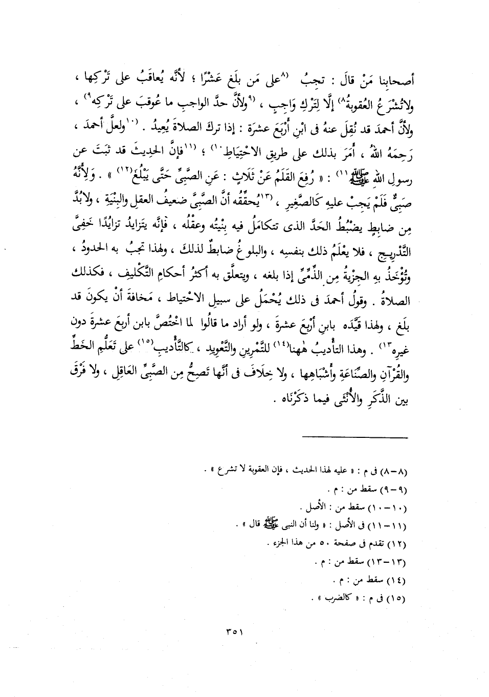 أصحابِنا مَنْ قالَ: تجِبُ [على مَن بلَغ عَشْرًا؛ لأنَّه يُعاقَبُ على تَرْكِها، ولا تُشْرَعُ العُقوبةُ] (٨) إلَّا لِتَرْكِ وَاجِبٍ، [ولأنَّ حدَّ الواجبِ ما عُوقبَ على تَرْكِه] (٩)، ولأنَّ أحمدَ قد نُقِلَ عنهُ في ابْنِ أَرْبَعَ عشرَة: إذا تركَ الصلاةَ يُعِيدُ. [ولعلَّ أحمدَ، رَحِمَهُ اللهُ، أَمَرَ بذلك على طريقِ الاحْتِيَاطِ] (١٠)؛ [فإنَّ الحدِيثَ قد ثبَتَ عن رسولِ اللهِ -صلى اللَّه عليه وسلم-] (١١): "رُفِعَ القَلَمُ عَنْ ثَلَاثٍ: عَنِ الصَّبِىِّ حَتَّى يَبْلُغَ (١٢) ". وَلِأَنَّهُ صَبِىٌّ فَلَمْ يَجِبْ عليهِ كَالصَّغِيرِ، [يُحقِّقُه أنَّ الصَّبِىَّ ضعيفُ العقلِ والبِنْيَةِ، ولا بُدَّ مِن ضابِطٍ يضْبُطُ الحَدَّ الذي تتكامَلُ فيه بِنْيتُه وعقْلُه، فإنَّه يتَزايدُ تزايُدًا خَفِىَّ التَّدْرِيجِ، فلا يعْلَمُ ذلك بنفسِه، والبلوغُ ضابطٌ لذلكَ، ولهذا تجبُ به الحدودُ، وتُؤْخَذُ بهِ الجِزْيةُ مِن الذِّمِّىِّ إذا بلغه، ويتعلَّق به أكثرُ أحكامِ التَّكْليفِ، فكذلك الصلاةُ. وقولُ أحمدَ في ذلك يُحْمَلُ على سبيلِ الاحْتياط، مَخافةَ أنْ يكونَ قد بلَغ، ولهذا قَيَّدَه بابنِ أرْبعَ عشرةَ، ولو أراد ما قالُوا لما اخْتُصَّ بابن أربعَ عشرةَ دون غيرِه] (١٣). وهذا التأْديبُ ههنا (١٤) للتَّمْرِينِ والتَّعْوِيدِ، كالتَّأْديبِ (١٥) على تَعَلُّمِ الخَطِّ والقُرْآنِ والصِّنَاعَةِ وأَشْبَاهِها، ولا خِلَافَ في أنَّها تَصِحُّ مِن الصَّبِىِّ العَاقِلِ، ولا فَرْقَ بين الذَّكَرِ والأُنْثَى فيما ذكَرْنَاه.
