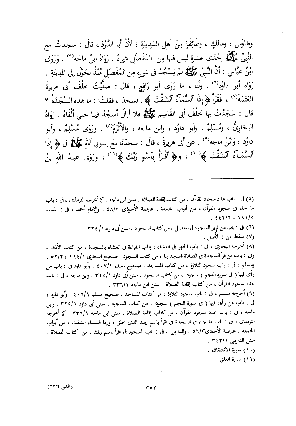 وطاوُس، ومالكٍ، وطَائِفَةٍ مِنْ أهلِ المَدِينَةِ؛ لأنَّ أبا الدَّرْدَاءِ قالَ: سجدتُ مع النَّبِيِّ -صلى اللَّه عليه وسلم- إحْدَى عشرة ليس فيها مِن المُفَصَّلِ شيءٌ. رَوَاهُ ابنُ ماجَه (٥). وَرَوَى ابْنُ عبَّاسٍ: أنَّ النَّبِىَّ -صلى اللَّه عليه وسلم- لمْ يَسْجُدْ في شيءٍ مِن المُفَصَّلِ مُنْذُ تحَوَّلَ إلى المدِينَةِ. رَوَاه أبو داوُد (٦). ولَنا، ما رَوَى أبو رَافِعٍ، قال: صلَّيْتُ خلْفَ أبي هريرةَ العَتَمَةَ (٧)، فَقَرَأَ {إِذَا السَّمَاءُ انْشَقَّتْ}. فسجدَ، فقلتُ: ما هذه السَّجْدَةُ؟ قال: سَجَدْتُ بها خَلْفَ أبى القَاسِمِ -صلى اللَّه عليه وسلم- فلا أزالُ أسجُدُ فيها حتى ألْقَاهُ. رَوَاهُ البخارِىُّ، ومُسْلِمٌ، وأبو داوُد، وابن ماجه، والأثْرَمُ (٨). ورَوَى مُسْلِمٌ، وَأبو داوُد، وَابْنُ ماجه (٩). عن أبي هريرةَ، قالَ: سجدْنَا معَ رسولِ اللهِ -صلى اللَّه عليه وسلم- في {إِذَا السَّمَاءُ انْشَقَّتْ} (١٠)، و {اقْرَأْ بِاسْمِ رَبِّكَ} (١١)، ورَوَى عبدُ اللهِ بنُ