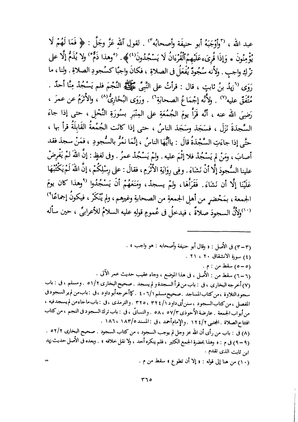عبد اللَّه، [وأوْجَبَهُ أبو حنيفَة وأصحابُه] (٣). لقولِ اللهِ عَزَّ وجَلَّ: {فَمَا لَهُمْ لَا يُؤْمِنُونَ (٢٠) وَإِذَا قُرِئَ عَلَيْهِمُ الْقُرْآنُ لَا يَسْجُدُونَ} (٤). [وهذا ذَمٌّ] (٥) ولا يُذَمُّ إلَّا على ترْكِ واجبٍ. ولأنه سُجُودٌ يُفْعَلُ في الصلاةِ، فكانَ واجبًا كسُجودِ الصلاةِ. ولنا، ما رَوَى [زيدُ بنُ ثابتٍ، قال: قرأتُ على النَّبِيِّ -صلى اللَّه عليه وسلم- النَّجْمَ فلم يَسْجُدْ مِنَّا أحدٌ. مُتَّفَقٌ عليه (٦). ولأَنَّه إجْمَاعُ الصحابَةِ] (٧). ورَوَى البُخَارِىُّ (٨)، والأثرَمُ عن عمرَ، رَضِىَ اللَّه عنه، أنَّه قَرَأَ يومَ الجُمُعَةِ على المِنْبَرِ بسُورَةِ النَّحْلِ، حتى إذا جاءَ السَّجدَةَ نَزَلَ، فسَجَدَ وسَجَدَ الناسُ، حتى إذا كانَت الجُمُعةُ القَابِلَةُ قرأ بها، حتَّى إذا جاءَتِ السَّجْدَةُ قالَ: يا أيُّهَا الناسُ، إنَّمَا نمُرُّ بالسُّجودِ، فمَنْ سجدَ فقد أصابَ، ومَنْ لم يَسْجُدْ فلا إثْمَ عليه. ولمْ يَسْجُدْ عمرُ. وفى لفظٍ: إنَّ اللهَ لمْ يَفْرِضْ علينا السُّجودَ إلَّا أنْ نَشَاءَ. وفِي رِوَايَةِ الأثْرَمِ، فقالَ: على رِسْلِكُمْ، إنَّ اللهَ لَمْ يَكْتُبْهَا عَلَيْنَا إلَّا أن نَشَاءَ. فَقَرَأَهَا، ولمْ يسجدْ، ومَنَعَهُمْ أنْ يَسْجُدُوا [وهذا كان يومَ الجمعة، بمَحْضرٍ من أهلِ الجمعةِ من الصحابةِ وغيرهم، ولم يُنْكَرْ، فيكونُ إجماعًا] (٩) (١٠) ولأنَّ السجودَ صلاةٌ، فيدخلُ في عُمومِ قولهِ عليه السلامُ للأعرابىِّ، حين سأله