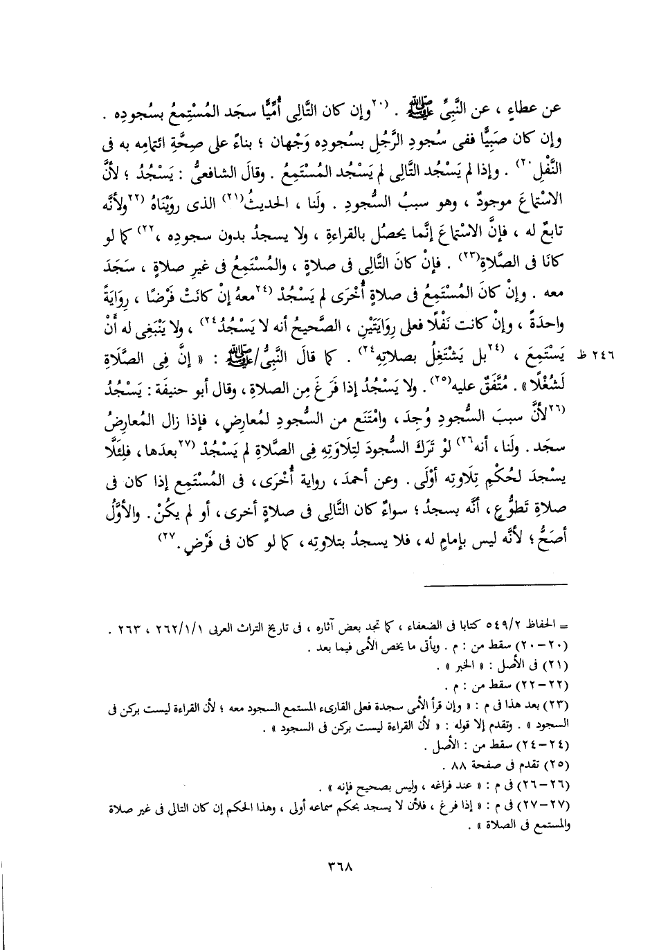 عن عطاءٍ، عن النَّبِيِّ -صلى اللَّه عليه وسلم-. [وإن كان التَّالِى أُمِّيًّا سجَد المُسْتِمعُ بسُجودِه. وإن كان صَبِيًّا ففى سُجودِ الرَّجُلِ بسُجودِه وَجْهان؛ بناءً على صِحَّةِ ائتمامِه به في النَّفْلِ] (٢٠). وإذا لم يَسْجُد التَّالِى لم يَسْجُد المُسْتَمِعُ. وقالَ الشافعيُّ: يَسْجُدُ؛ لأنَّ الاسْتماعَ موجودٌ، وهو سببُ السُّجودِ. ولَنا، الحديثُ (٢١) الذي روَيْنَاهُ [ولأنَّه تابعٌ له، فإنَّ الاسْتماعَ إنَّما يحصُل بالقراءةِ، ولا يسجدُ بدون سجودِه، ] (٢٢) كما لو كانَا في الصَّلاةِ (٢٣). فإنْ كانَ التَّالِى في صلاةٍ، والمُسْتَمِعُ في غيرِ صلاةٍ، سَجَدَ معه. وإنْ كانَ المُسْتَمِعُ في صلاةٍ أُخْرَى لم يَسْجُدْ [معهُ إنْ كانَتْ فَرْضًا، رِوَايَةً واحدَةً، وإنْ كانت نَفْلًا فعلى رِوَايَتَيْنِ، الصَّحيحُ أنه لا يَسْجُدُ] (٢٤)، ولا يَنْبَغِى له أَنْ يَسْتَمِعَ، [بل يَشْتَغِلُ بصلاتِهِ] (٢٤). كما قالَ النَّبِىُّ -صلى اللَّه عليه وسلم-: "إنَّ في الصَّلَاةِ لَشُغْلًا". مُتَّفَقٌ عليه (٢٥). ولا يَسْجُدُ إذا فَرَغَ مِن الصلاةِ، وقال أبو حنيفَة: يَسْجُدُ [لأنَّ سببَ السُّجودِ وُجِدَ، وامْتَنَع من السُّجودِ لمُعارِضٍ، فإذا زال المُعارِضُ سجَد. ولَنا، أنه] (٢٦) لوْ تَرَكَ السُّجودَ لتِلَاوَتِهِ في الصَّلاةِ لم يَسْجُدْ [بعدَها، فلِئَلَّا يسْجدَ لحُكْمِ تِلَاوتِه أوْلَى. وعن أحمدَ، رواية أُخْرَى، في المُسْتَمِع إذا كان في صلاةِ تَطوُّعٍ، أنَّه يسجدُ؛ سواءٌ كان التَّالِى في صلاةٍ أخرى، أو لم يكُنْ. والأوَّلُ أصَحُّ؛ لأنَّه ليس بإمامٍ له، فلا يسجدُ بتلاوتِه، كما لو كان في فَرْضٍ.] (٢٧)