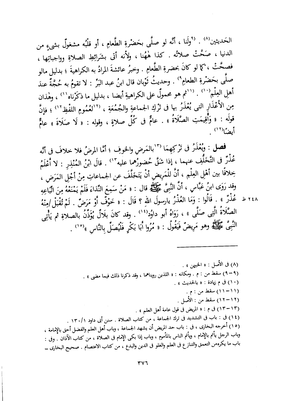 فصل: ويُعْذَرُ في تَرْكِهِمَا [بالمَرضِ والخوفِ؛ أمَّا المرضُ فلا خلافَ في أنَّه عُذْرٌ في التَّخَلُّفِ عنهما، إذا شَقَّ حُضورُهما عليه] (١٣). قالَ ابْنُ المُنْذِرِ: لا أَعْلَمُ خِلافًا بين أهْلِ العِلْمِ، أنَّ للْمَرِيضِ أنْ يَتَخَلَّفَ عن الجماعاتِ مِنْ أجْلِ المَرَضِ، وقد رَوَى ابنُ عَبَّاسٍ، أنَّ النَّبِىَّ -صلى اللَّه عليه وسلم- قال: "مَنْ سَمِعَ النِّدَاءَ فَلَمْ يَمْنَعْهُ مِنَ اتِّبَاعِهِ عُذْرٌ". قَالُوا: وَمَا العُذْرُ يا رسولَ اللهِ؟ قَالَ: "خَوْفٌ أَوْ مَرَضٌ. لَمْ تُقْبَلْ مِنْهُ الصَّلَاةُ الَّتِى صَلَّى"، رَوَاهُ أبو داوُد (١٤). وقد كانَ بلَالٌ يُؤَذِّنُ بالصلاةِ ثم يَأْتِى النَّبِىَّ -صلى اللَّه عليه وسلم- وهو مَرِيضٌ فَيَقُولُ: "مُرُوا أَبا بَكْرٍ فَلْيُصَلِّ بِالنَّاسِ" (١٥).