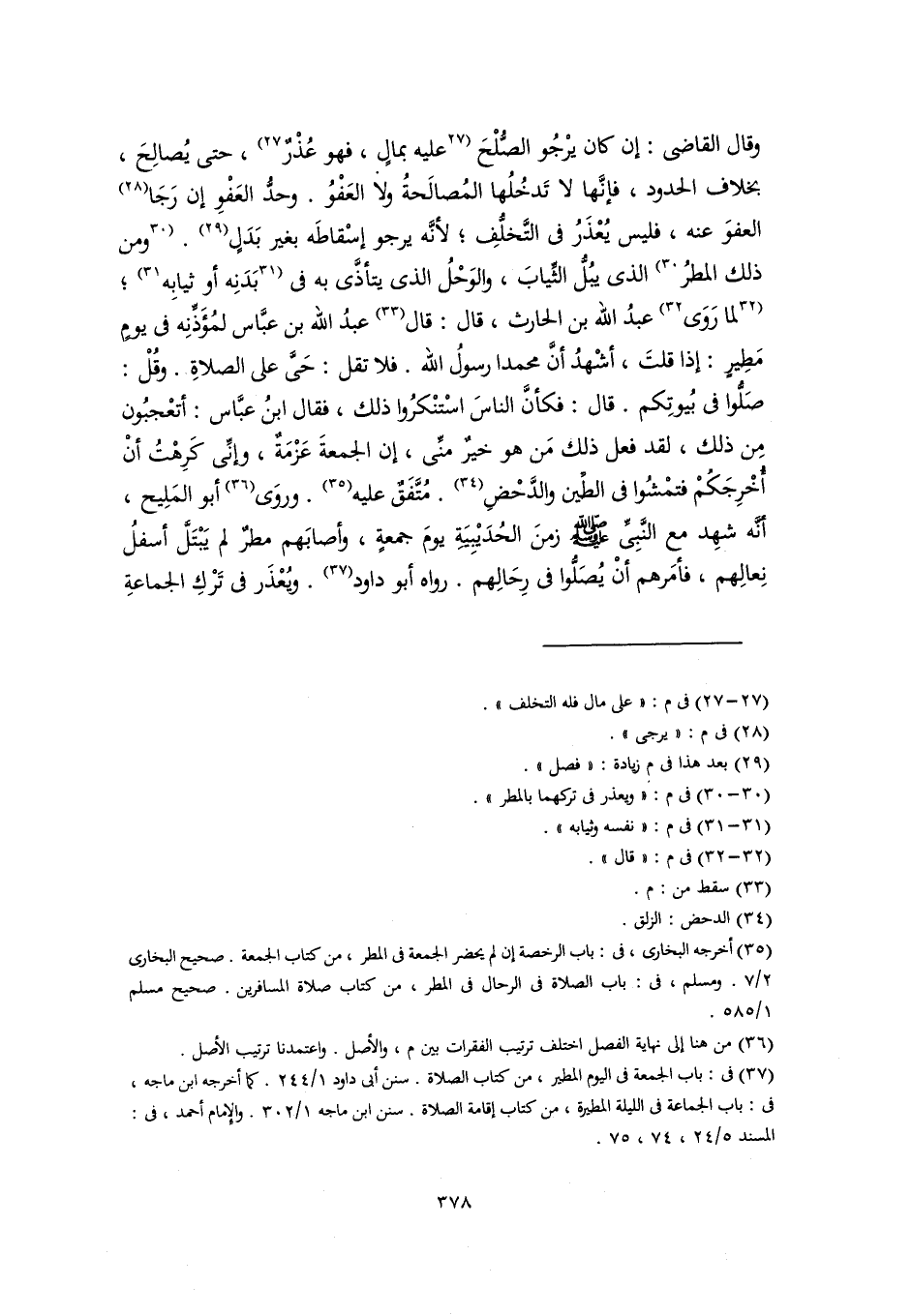 وقال القاضي: إن كان يرْجُو الصُّلْحَ [عليه بمالٍ، فهو عُذْرٌ] (٢٧)، حتى يُصالِحَ، بخلاف الحدود، فإنَّها لا تَدخُلُها المُصالَحةُ ولا العَفْوُ. وحدُّ العَفْوِ إن رَجَا (٢٨) العفوَ عنه، فليس يُعْذَرُ في التَّخلُّفِ؛ لأنَّه يرجو إسْقاطَه بغير بَدَلٍ (٢٩). [ومن ذلك المطرُ] (٣٠) الذي يبُلُّ الثِّيابَ، والوَحْلُ الذي يتأذَّى به في [بَدَنِه أو ثيابِه] (٣١)؛ [لما رَوَى] (٣٢) عبدُ اللَّه بن الحارث، قال: قال (٣٣) عبدُ اللَّه بن عبَّاس لمُؤَذِّنِه في يومٍ مَطِيرٍ: إذا قلتَ، أشْهدُ أنَّ محمدا رسولُ اللَّه. فلا تقل: حَىَّ على الصلاةِ. وقُلْ: صَلُّوا في بُيوتِكم. قال: فكأنَّ الناسَ اسْتنْكرُوا ذلك، فقال ابنُ عبَّاس: أتعْجبُون مِن ذلك، لقد فعل ذلك مَن هو خيرٌ منِّى، إن الجمعةَ عَزْمَةٌ، وإنِّى كَرِهْتُ أنْ أُخْرِجَكُمْ فتمْشُوا في الطِّين والدَّحْضِ (٣٤). مُتَّفَقٌ عليه (٣٥). وروَى (٣٦) أبو المَلِيح، أنَّه شهِد مع النَّبِيِّ -صلى اللَّه عليه وسلم- زمنَ الحُدَيْبِيَةِ يومَ جمعةٍ، وأصابَهم مطرٌ لم يَبْتَلَّ أسفلُ نِعالِهم، فأمَرهم أن يُصَلُّوا في رِحَالِهم. رواه أبو داود (٣٧). ويُعْذَر في تَرْكِ الجماعةِ