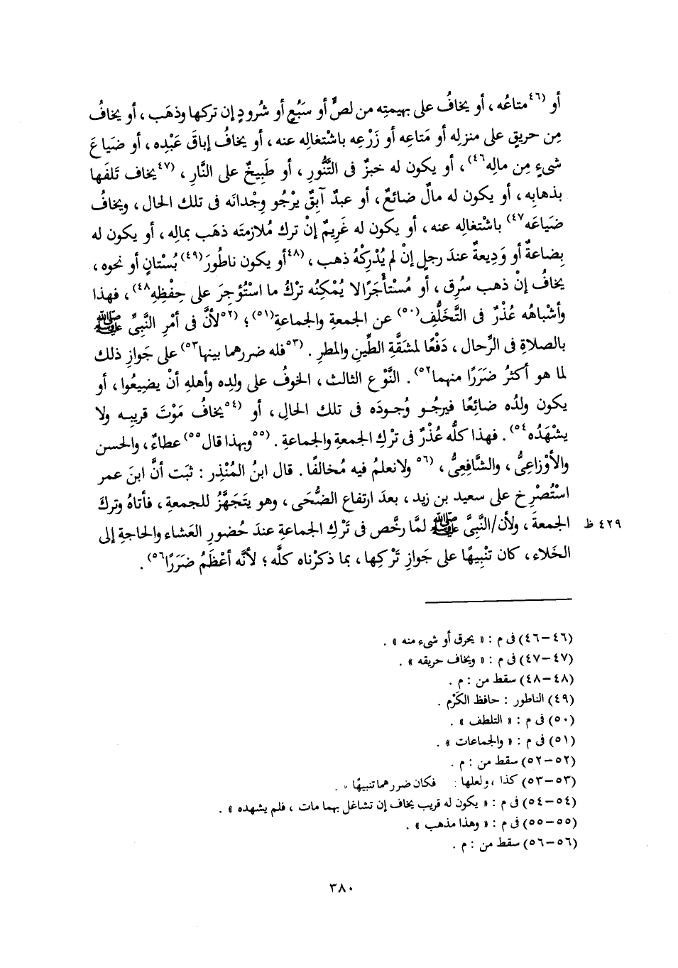 أو [متاعُه، أو يخافُ على بهيمتِه من لصٍّ أو سَبُعٍ أو شُرودٍ إن تركها وذهَب، أو يخافُ مِن حريقٍ على منزلِه أو مَتاعِه أو زَرْعِه باشْتغالِه عنه، أو يخافُ إباقَ عَبْدِه، أو ضَياعَ شيءٍ مِن مالِه] (٤٦)، أو يكون له خبزٌ في التَّنُّورِ، أو طَبِيخٌ على النَّارِ، [يخاف تَلفَها بذهابِه، أو يكون له مالٌ ضائعٌ، أو عبدٌ آبِقٌ يرْجُو وِجْدانَه في تلك الحال، ويخافُ ضَياعَه] (٤٧) باشْتغالِه عنه، أو يكون له غَرِيمٌ إنْ ترك مُلازمتَه ذهَب بمالِه، أو يكون له بِضاعةٌ أو وَدِيعةٌ عندَ رجلٍ إنْ لم يُدْرِكْهُ ذهب، [أو يكون ناطُورَ (٤٨) بُسْتانٍ أو نحوه، يخافُ إنْ ذهب سُرِق، أو مُسْتَأْجَرًا لا يُمْكِنُه ترْكُ ما اسْتُؤجرَ على حِفْظِهِ] (٤٩)، فهذا وأشْباهُه عُذْرٌ في التَّخَلُّفِ (٥٠) عن الجمعةِ والجماعةِ (٥١)؛ [لأنَّ في أمْرِ النَّبِيِّ -صلى اللَّه عليه وسلم- بالصلاةِ في الرِّحال، دَفْعًا لمشَقَّةِ الطِّينِ والمطرِ. [فله ضررهما بينها] (٥٢) على جَوازِ ذلك لما هو أكثرُ ضَرَرًا منهما] (٥٣). النَّوْع الثالث، الخوفُ على ولدِه وأهلهِ أنْ يضِيعُوا، أو يكون ولدُه ضائِعًا فيرجُو وُجودَه في تلك الحالِ، أو [يخافُ مَوْتَ قريبِه ولا يشْهَدُه] (٥٤). فهذا كلُّه عُذْرٌ في ترْكِ الجمعةِ والجماعةِ. [وبهذا قال] (٥٥) عطاءٌ، والحسن والأوْزاعِىُّ، والشَّافِعِىُّ، [ولا نعلمُ فيه مُخالفًا. قال ابنُ المُنْذِر: ثبَت أنَّ ابنَ عمر اسْتُصْرِخ على سعيد بن زيد، بعدَ ارتفاع الضُّحَى، وهو يتَجَهَّزُ للجمعةِ، فأتاهُ وتركَ الجمعةَ، ولأن النَّبِىَّ -صلى اللَّه عليه وسلم- لمَّا رخَّص في تَرْكِ الجماعةِ عندَ حُضورِ العَشاء والحاجةِ إلى الخَلاء، كان تنْبِيهًا على جَوازِ تَرْكِها، بما ذكرْناه كلَّه؛ لأنَّه أعْظَمُ ضَرَرًا] (٥٦).