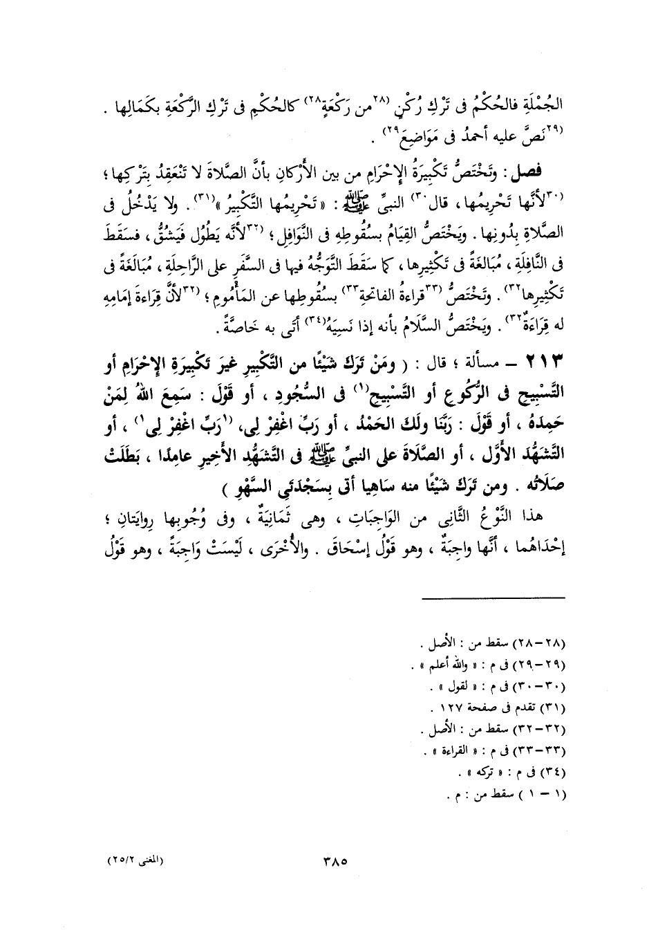 ٢١٣ - مسألة؛ قال: (ومَنْ تَرَك شَيْئًا من التَّكْبِيرِ غيرَ تَكْبِيرَةِ الإِحْرَامِ أو التَّسْبِيحِ في الرُّكُوعِ أو التَّسْبِيحِ (١) في السُّجُودِ، أو قَوْلَ: سَمِعَ اللهُ لِمَنْ حَمِدَهُ، أو قَوْلَ: رَبَّنَا ولَكَ الحَمْدُ، أو رَبِّ اغْفِرْ لِى، [رَبِّ اغْفِرْ لِى] (١)، أو التَّشَهُّدَ الأَوَّل، أو الصَّلَاةَ على النبيِّ -صلى اللَّه عليه وسلم- في التَّشَهُّدِ الأَخِيرِ عامِدًا، بَطَلَتْ صَلَاتُه. ومن تَرَك شَيْئًا منه سَاهِيا أتى بِسَجْدَتَىِ السَّهْوِ)