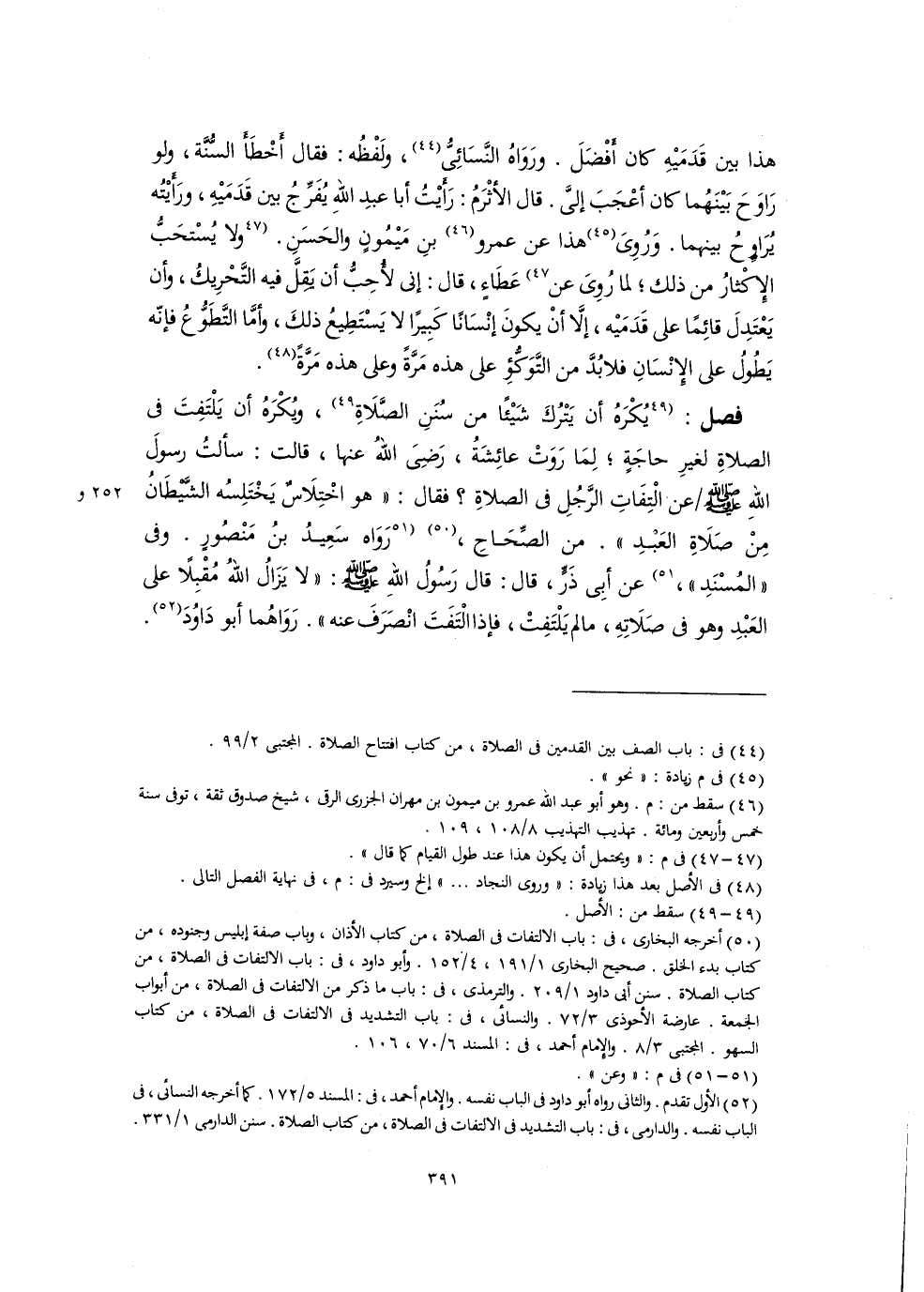 (٤٤) في: باب الصف بين القدمين في الصلاة، من كتاب افتتاح الصلاة. المجتبى ٢/ ٩٩.