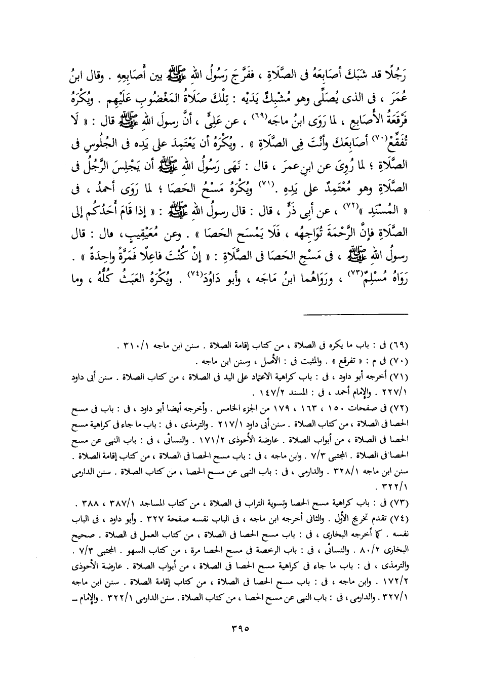 رَجُلًا قد شَبَكَ أصَابِعَهُ في الصَّلَاةِ، ففَرَّجَ رَسُولُ اللهِ -صلى اللَّه عليه وسلم- بين أَصَابِعِهِ. وقال ابنُ عُمَرَ، في الذي يُصَلِّى وهو مُشْبِكٌ يَدَيْه: تِلْكَ صَلَاةُ المَغْضُوبِ عَلَيْهِم. ويُكْرَهُ فَرْقَعَةُ الأَصَابِعِ، لما رَوَى ابنُ ماجَه (٦٩)، عن عَلِيٍّ، أنَّ رسولَ اللهِ -صلى اللَّه عليه وسلم- قال: "لَا تُفَقِّعْ (٧٠) أصَابِعَكَ وأَنْتَ فِي الصَّلَاةِ". ويُكْرَهُ أن يَعْتَمِدَ على يَدِه في الجُلُوسِ في الصَّلَاة؛ لما رُوِىَ عن ابنِ عمرَ، قال: نَهَى رَسُولُ اللهِ -صلى اللَّه عليه وسلم- أنْ يَجْلِسَ الرَّجُلُ في الصَّلَاةِ وهو مُعْتَمِدٌ على يَدِهِ. (٧١) ويُكْرَهُ مَسْحُ الحَصَا؛ لما رَوَى أحمدُ، في "المُسْنَدِ" (٧٢)، عن أبِى ذَرٍّ، قال: قال رسولُ اللهِ -صلى اللَّه عليه وسلم-: "إِذا قَامَ أَحَدُكُم إلى الصَّلَاةِ فإنَّ الرَّحْمَةَ تُوَاجِهُه، فَلَا يَمْسَح الحَصَا". وعن مُعَيْقِيبٍ، قال: قال رسولُ اللهِ -صلى اللَّه عليه وسلم-، في مَسْحِ الحَصَا في الصَّلَاةِ: "إنْ كُنْتَ فاعِلًا فَمَرَّةً واحِدَةً". رَوَاهُ مُسْلِمٌ (٧٣)، ورَوَاهُما ابنُ مَاجَه، وأبو دَاوُدَ (٧٤). ويُكْرَهُ العَبَثُ كُلُّهُ، وما
