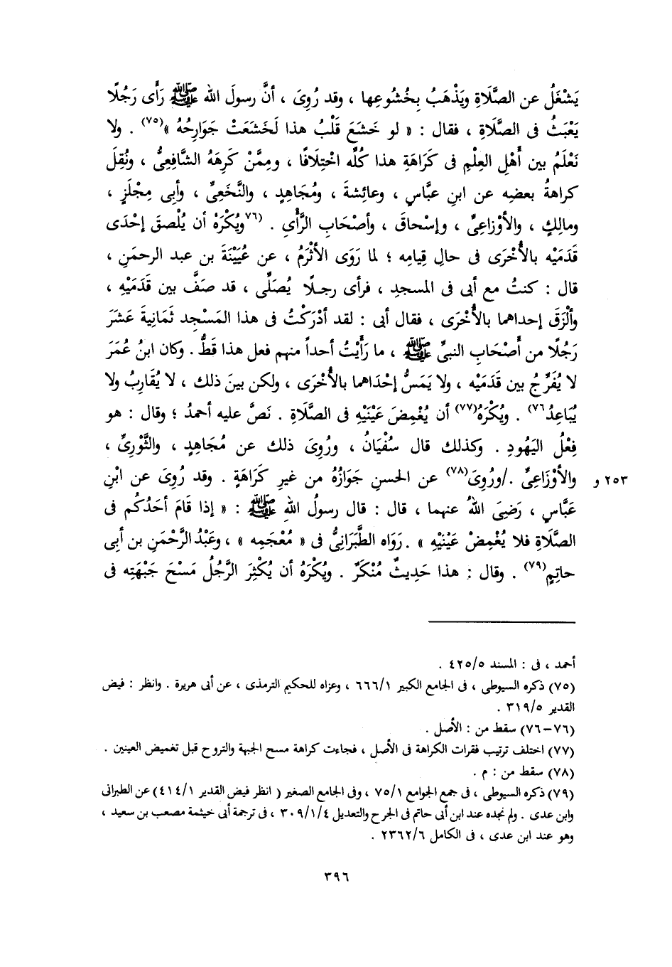 يَشْغَلُ عن الصَّلَاةِ ويَذْهَبُ بِخُشُوعِها، وقد رُوِىَ، أنَّ رسولَ اللَّه -صلى اللَّه عليه وسلم- رَأَى رَجُلًا يَعْبَثُ في الصَّلَاةِ، فقال: "لو خَشَعَ قَلْبُ هذا لَخَشَعَتْ جَوَارِحُهُ" (٧٥). ولا نَعْلَمُ بين أَهْلِ العِلْمِ في كَرَاهَةِ هذا كُلِّه اخْتِلَافًا، ومِمَّنْ كَرِهَهُ الشَّافِعِىُّ، ونُقِلَ كراهةُ بعضِه عن ابنِ عبَّاسٍ، وعائِشةَ، ومُجَاهِدٍ، والنَّخَعِىِّ، وأبِى مِجْلَزٍ، ومالِكٍ، والأوْزاعِىِّ، وإسْحاقَ، وأَصْحَابِ الرَّأْىِ. [ويُكْرَه أن يُلْصقَ إحْدَى قَدَمَيْه بالأُخْرَى حالِ قِيامِه؛ لما رَوَى الأثْرَمُ، عن عُيَيْنَةَ بن عبد الرحمَنِ، قال: كنتُ مع أبي في المسجدِ، فرأى رجلًا يُصَلِّى، قد صَفَّ بين قَدَمَيْهِ، وألْزَقَ إحداهما بالأُخْرَى، فقال أبي: لقد أدْرَكْتُ في هذا المَسْجِد ثَمَانِيةَ عَشَرَ رَجُلًا من أَصْحَابِ النبيِّ -صلى اللَّه عليه وسلم-، ما رَأَيْتُ أحدًا منهم فعل هذا قَطُّ. وكان ابنُ عُمَرَ لا يُفَرِّجُ بين قَدَمَيْه، ولا يَمَسُّ إِحْدَاهما بالأُخْرَى، ولكن بينَ ذلك، لا يُقَارِبُ ولا يُبَاعِدُ] (٧٦). ويُكْرَهُ (٧٧) أن يُغْمِضَ عَيْنَيْهِ في الصَّلَاةِ. نَصَّ عليه أحمدُ؛ وقال: هو فِعْلُ اليَهُودِ. وكذلك قال سُفْيَانُ، ورُوِىَ ذلك عن مُجَاهِدٍ، والثَّوْرِىِّ، والأوْزَاعِيِّ. ورُوِىَ (٧٨) عن الحسنِ جَوَازُهُ من غيرِ كَرَاهَةٍ. وقد رُوِىَ عن ابْنِ عَبَّاسٍ، رَضِىَ اللهُ عنهما، قال: قال رسولُ اللهِ -صلى اللَّه عليه وسلم-: "إذا قَامَ أحَدُكُم في الصَّلَاةِ فلا يُغْمِضْ عَيْنَيْهِ". روَاه الطَّبَرَانِىُّ في "مُعْجَمِه"، وعَبْدُ الرَّحْمَنِ بن أبِى حاتِمٍ (٧٩)، وقال: هذا حَدِيثٌ مُنْكَرٌ. ويُكْرَهُ أن يُكْثِرَ الرَّجُلُ مَسْحَ جَبْهَتِه في