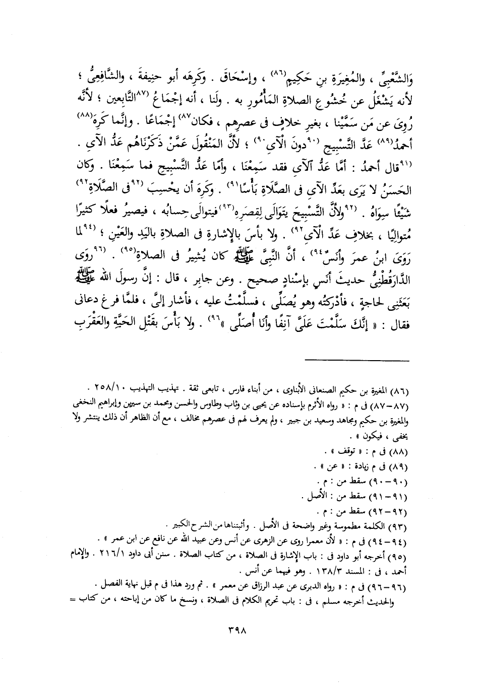 وَالشَّعْبِىِّ، والمُغِيرَةِ بنِ حَكِيمٍ (٨٦)، وإسْحَاقَ. وكَرِهَه أبو حنِيفةَ، والشَّافِعِىُّ؛ لأنه يَشْغَلُ عن خُشُوعِ الصلاةِ المَأْمُورِ به. ولَنا، أنه إجْمَاعُ [التَّابِعين؛ لأنَّه رُوِىَ عن مَن سَمَّيْنا، بغيرِ خلافٍ في عصرِهم، فكان] (٨٧) إجْمَاعًا. وإنَّما كَرِهَ (٨٨) أحمدُ (٨٩) عَدَّ التَّسْبِيحِ [دونَ الْآىِ] (٩٠)؛ لأنَّ المَنْقُولَ عَمَّنْ ذَكَرْنَاهُم عَدُّ الآىِ. [قال أحمدُ: أمَّا عَدُّ الآىِ فقد سَمِعْنَا، وأمّا عَدُّ التَّسْبِيحِ فما سَمِعْنَا. وكان الحَسَنُ لا يَرَى بعَدِّ الآىِ في الصَّلَاةِ بَأْسًا] (٩١). وكَرِهَ أن يحْسِبَ [في الصَّلَاةِ] (٩٢) شَيْئًا سِوَاهُ. [ولأنَّ التَّسْبِيحَ يتَوَالَى لِقِصَرِهِ (٩٣) فيتوالَى حِسابُه، فيصيرُ فعلًا كثيرًا مُتوالِيًا، بخلافِ عَدِّ الْآىِ] (٩٢). ولا بأسَ بالإِشارةِ في الصلاةِ باليَدِ والعَيْنِ؛ [لما رَىَ ابنُ عمرَ وأَنَسٌ] (٩٤)، أنَّ النَّبِىَّ -صلى اللَّه عليه وسلم- كان يُشِيرُ في الصلاةِ (٩٥). [روَى الدَّارَقُطنِىُّ حديثَ أنَسٍ بإسْنادٍ صحيح. وعن جابِر، قال: إنَّ رسولَ اللَّه -صلى اللَّه عليه وسلم- بَعَثَنِى لحاجةٍ، فأدْرَكتُه وهو يُصَلِّى، فسلَّمْتُ عليه، فأشار إلىَّ، فلمَّا فرغ دعاني فقال: "إنَّكَ سَلَّمْتَ عَلَيَّ آنِفًا وأنَا أُصَلِّى"] (٩٦). ولا بَأْسَ بقَتْلِ الحَيَّةِ والعَقْرَبِ