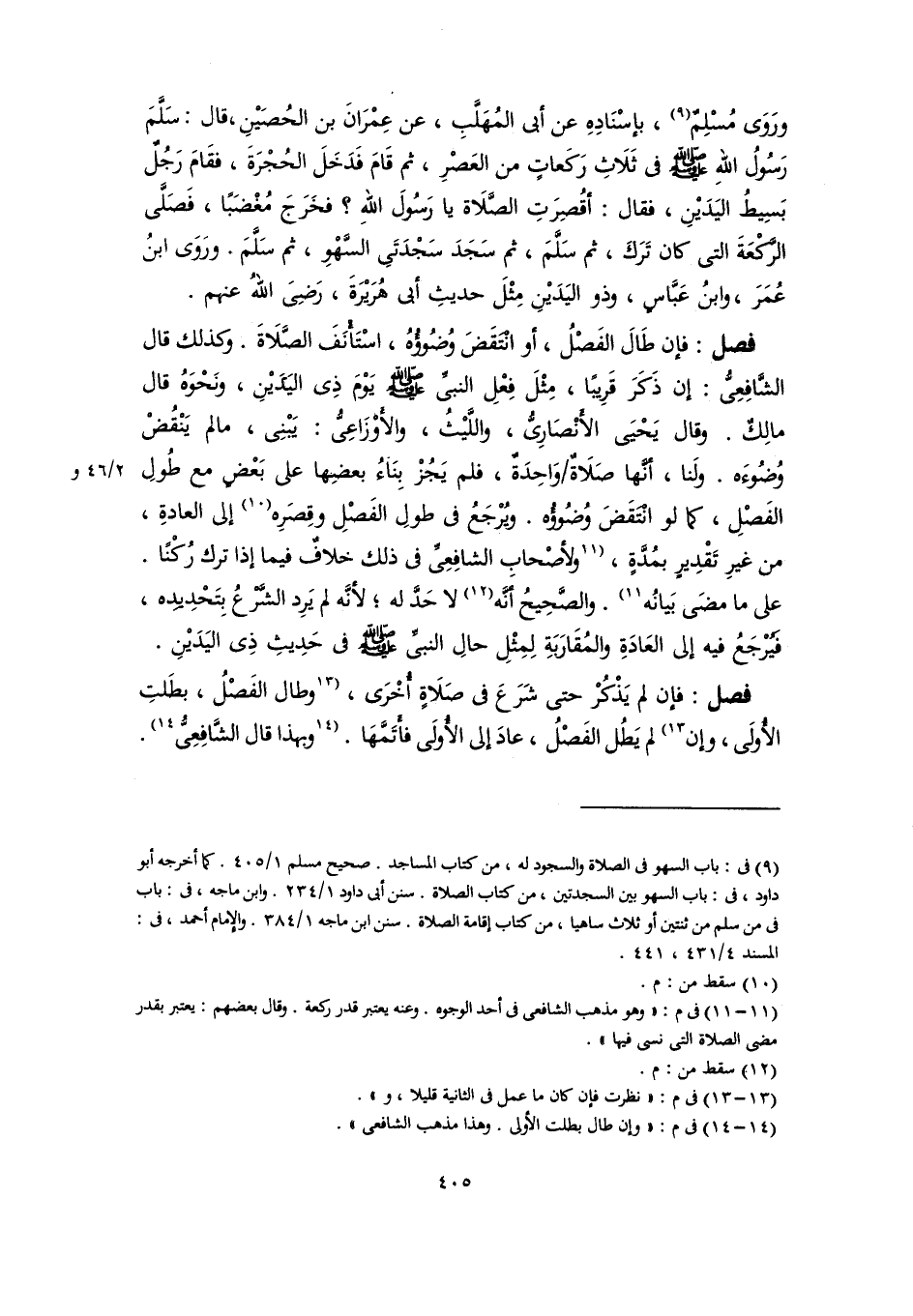 (٩) في: باب السهو في الصلاة والسجود له، من كتاب المساجد. صحيح مسلم ١/ ٤٠٥. كما أخرجه أبو داود، في: باب السهو بين السجدتين، من كتاب الصلاة. سنن أبي داود ١/ ٢٣٤. وابن ماجه، في: باب في من سلم من ثنتين أو ثلاث ساهيا، من كتاب إقامة الصلاة. سنن ابن ماجه ١/ ٣٨٤. والإمام أحمد، في: المسند ٤/ ٤٣١، ٤٤١.