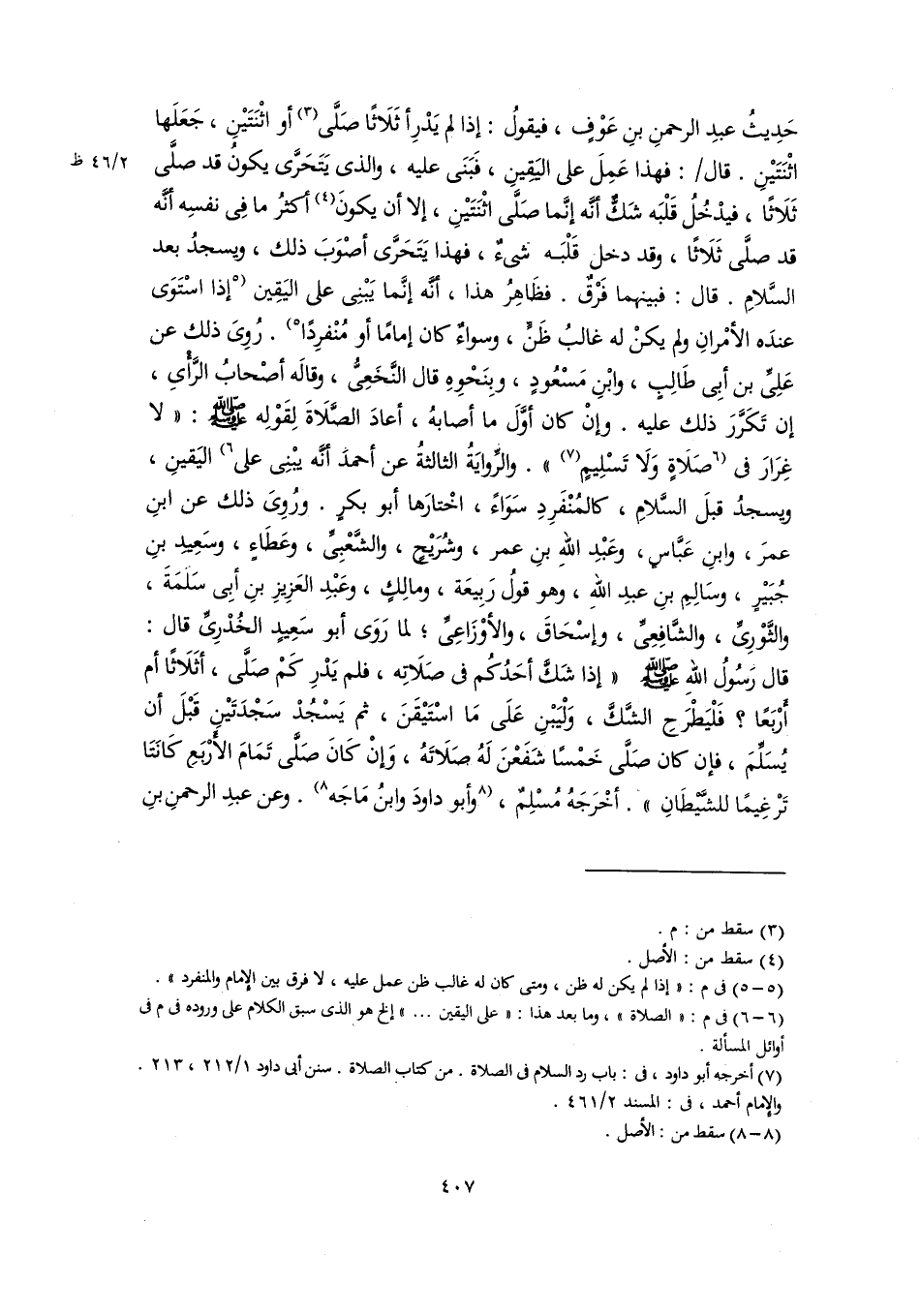 حَدِيثُ عبدِ الرحمنِ بنِ عَوْفٍ، فيقولُ: إذا لم يَدْرِ أثَلَاثًا صَلَّى (٣) أو اثْنَتَيْنِ، جَعَلَها اثْنَتَيْنِ. قال: فهذا عَمِلَ على اليَقِينِ، فَبَنَى عليه، والذي يَتَحَرَّى يكونُ قد صلَّى ثَلَاثًا، فيدْخُلُ قَلْبَه شَكٌّ أنَّه إنَّما صَلَّى اثْنَتَيْنِ، إلا أن يكونَ (٤) أكثرُ ما فِي نفسِه أنَّه قد صلَّى ثَلَاثًا، وقد دخل قَلْبَه شيءٌ، فهذا يَتَحَرَّى أصْوَبَ ذلك، ويسجدُ بعد السَّلامِ. قال: فبينهما فَرْقٌ. فظَاهِرُ هذا، أنَّه إنَّما يَبْنِى على اليَقِين [إذا اسْتَوَى عندَه الأمْرانِ ولم يكنْ له غالبُ ظَنٍّ، وسواءٌ كان إمامًا أو مُنْفرِدًا] (٥). رُوِىَ ذلك عن عَلِىِّ بن أبِى طَالِبٍ، وابْنِ مَسْعُودٍ، وبِنَحْوِهِ قال النَّخَعِىُّ، وقالَه أصْحابُ الرَّأْىِ، إن تَكَرَّرَ ذلك عليه. وإنْ كان أوَّلَ ما أصابهُ، أعادَ الصَّلَاةَ لِقَوْلِه -صلى اللَّه عليه وسلم-: "لا غِرَارَ في [صَلَاةٍ وَلَا تَسْلِيمٍ (٦) ". والرِّوايَةُ الثالثةُ عن أحمدَ أنَّه يبْنِى على] (٧) اليَقينِ، ويسجدُ قبلَ السَّلامِ، كالمُنْفَرِدِ سَوَاءً، اخْتارَها أبو بكرٍ. ورُوِىَ ذلك عن ابنِ عمرَ، وابنِ عَبَّاسٍ، وعَبْدِ اللهِ بنِ عمر، وشُرَيْحٍ، والشَّعْبِىِّ، وعَطَاءٍ، وسَعِيدِ بنِ جُبَيْرٍ، وسَالِمِ بنِ عبدِ اللهِ، وهو قولُ رَبِيعَة، ومالِكٍ، وعَبْدِ العَزِيزِ بنِ أبِى سَلمَةَ، والثَّوْرِىِّ، والشَّافِعِيِّ، وإسْحَاقَ، والأوْزَاعِيِّ؛ لما رَوَى أبو سَعِيدٍ الخُدْرِيِّ قال: قَال رَسُولُ اللهِ -صلى اللَّه عليه وسلم- "إذا شَكَّ أَحَدُكُم في صَلَاتِه، فلم يَدْرِ كَمْ صَلَّى، أثَلَاثًا أم أَرْبَعًا؟ فَلْيَطْرَحِ الشَّكَّ، وَلْيَبْنِ عَلَى مَا اسْتَيْقَنَ، ثم يَسْجُدْ سَجْدَتَيْنِ قَبْلَ أن يُسَلِّمَ، فإن كان صَلَّى خَمْسًا شَفَعْنَ لَهُ صَلَاتَهُ، وَإنْ كَانَ صَلَّى تَمَامَ الأَرْبَعِ كَانَتَا تَرْغِيمًا للشَّيْطَانِ". أخْرَجَهُ مُسْلِمٌ، [وأبو داودَ وابنُ مَاجَه] (٨). وعن عبدِ الرحمنِ بنِ