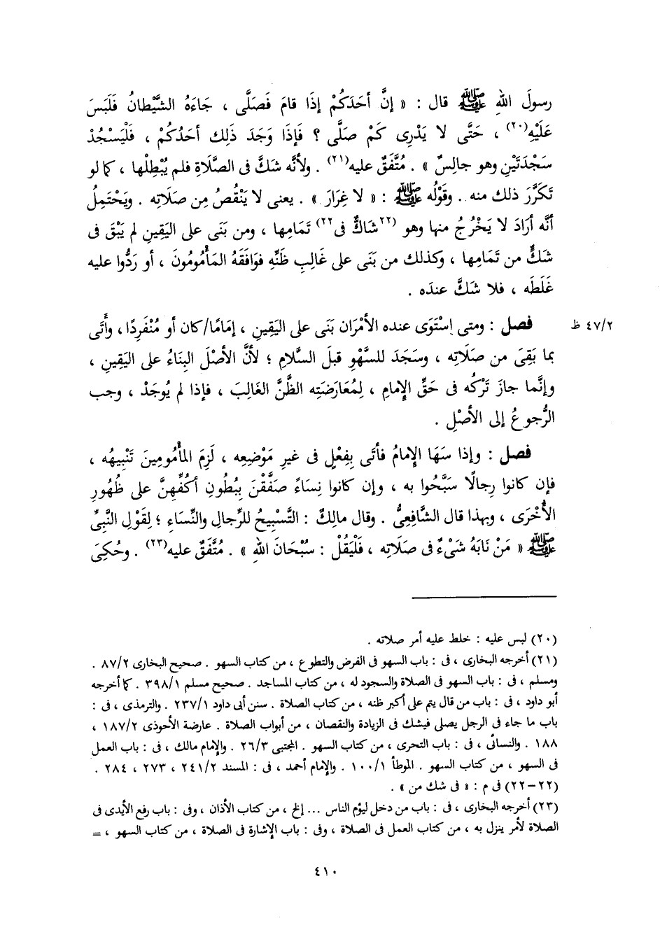 (٢١) أخرجه البخاري، في: باب السهو في الفرض والتطوع، من كتاب السهو. صحيح البخاري ٢/ ٨٧. ومسلم، في: باب السهو في الصلاة والسجود له، من كتاب المساجد. صحيح مسلم ١/ ٣٩٨. كما أخرجه أبو داود، في: باب من قال يتم على أكبر ظنه، من كتاب الصلاة. سنن أبي داود ١/ ٢٣٧. والترمذي، في: باب ما جاء في الرجل يصلي فيشك في الزيادة والنقصان، من أبواب الصلاة. عارضة الأحوذي ٢/ ١٨٧، ١٨٨. والنسائي، في: باب التحرى، من كتاب السهو. المجتبى ٣/ ٢٦. والإمام مالك، في: باب العمل في السهو، من كتاب السهو. الموطأ ١/ ١٠٠. والإمام أحمد، في: المسند ٢/ ٢٤١، ٢٧٣، ٢٨٤.