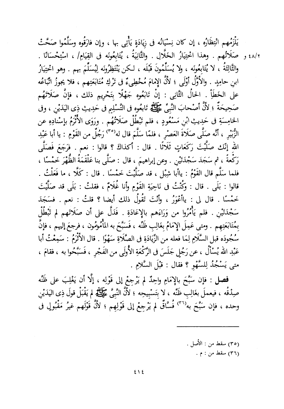 يَلْزَمُهم انْتِظَارُه، إن كان نِسْيَانُه في زِيَادَةٍ يَأْتِى بها، وإن فارَقُوه وسَلَّمُوا صَحَّتْ صَلَاتُهم. وهذا اخْتِيَارُ الخَلَّالِ. والثَّانِيَةُ، يُتَابِعُونَه في القِيَامِ، اسْتِحْسَانًا. والثَّالِثَةُ، لا يُتَابِعُونَه، ولا يُسَلِّمُونَ قَبْلَه، لكن يَنْتَظِرُونَه لِيُسَلِّمَ بهم. وهو اخْتِيَارُ ابنِ حامِدٍ. والأوَّلُ أوْلَى؛ لأنَّ الإِمامَ مُخْطِىءٌ في تَرْكِ مُتَابَعَتِهم، فلا يجوزُ اتِّبَاعُه على الخَطَإِ. الحالُ الثَّانِى: إنْ تَابَعُوه جَهْلًا بِتَحْرِيمِ ذلك، فإنَّ صَلَاتَهُم صَحِيحَةٌ؛ لأنَّ أصْحابَ النَّبِيِّ -صلى اللَّه عليه وسلم- تَابعُوه في التَّسْلِيم في حَدِيثِ ذِى اليَدَيْنِ، وفي الخامِسَةِ في حَدِيثِ ابْنِ مَسْعُودٍ، فلم تَبْطُلْ صَلَاتُهُم. ورَوَى الأَثْرَمُ بإسْنادِهِ عن الزُّبَيْرِ، أنَّه صَلَّى صَلَاةَ العَصْرِ، فلمّا سَلَّمَ قال له (٣٥) رَجُلٌ من القَوْمِ: يا أبا عَبْدِ اللهِ إنّك صَلَّيْتَ رَكَعَاتٍ ثَلَاثًا. قال: أكذاكَ؟ قالوا: نعم. فرَجَعَ فَصَلَّى رَكْعةً، ثم سَجَدَ سَجْدَتَيْنِ. وعن إبراهيمَ، قال: صَلَّى بنا عَلْقَمَةُ الظُّهْرَ خَمْسًا، فلما سَلَّم قال القَوْمُ: يا أبا شِبْل، قد صَلَّيْتَ خَمْسًا. قال: كَلَّا، ما فَعَلْتُ. قالوا: بَلَى. قال: وكُنْتُ في نَاحِيَةِ القَوْمِ وأنا غُلَامٌ، فقلتُ: بَلَى قد صَلَّيْتَ خَمْسًا. قال لي: يا أعْوَرُ، وأنْتَ تَقُولُ ذلك أيضًا؟ قلتُ: نعم. فسَجَدَ سَجْدَتَيْنِ. فلم يَأْمُرُوا من وَرَاءَهم بالإِعَادَةِ. فَدَلَّ على أن صَلَاتَهم لم تَبْطُلْ بِمُتَابَعَتِهِم. ومتى عَمِلَ الإِمَامُ بِغَالِبِ ظَنِّه، فَسَبَّحَ به المأْمُومُون، فرجعَ إليهم، فإنَّ سُجُودَه قبل السَّلَامِ لِمَا فعله من الزِّيَادَةِ في الصَّلَاةِ سَهْوًا. قال الأثْرَمُ: سَمِعْتُ أبا عَبْدِ اللَّه يُسْألُ، عن رَجُلٍ جَلَسَ في الرَّكْعَةِ الأُولَى من الفَجْرِ، فَسَبَّحُوا به، فقامَ، متى يَسْجُدُ لِلسَّهْوِ؟ فقال: قبْلَ السَّلامِ.