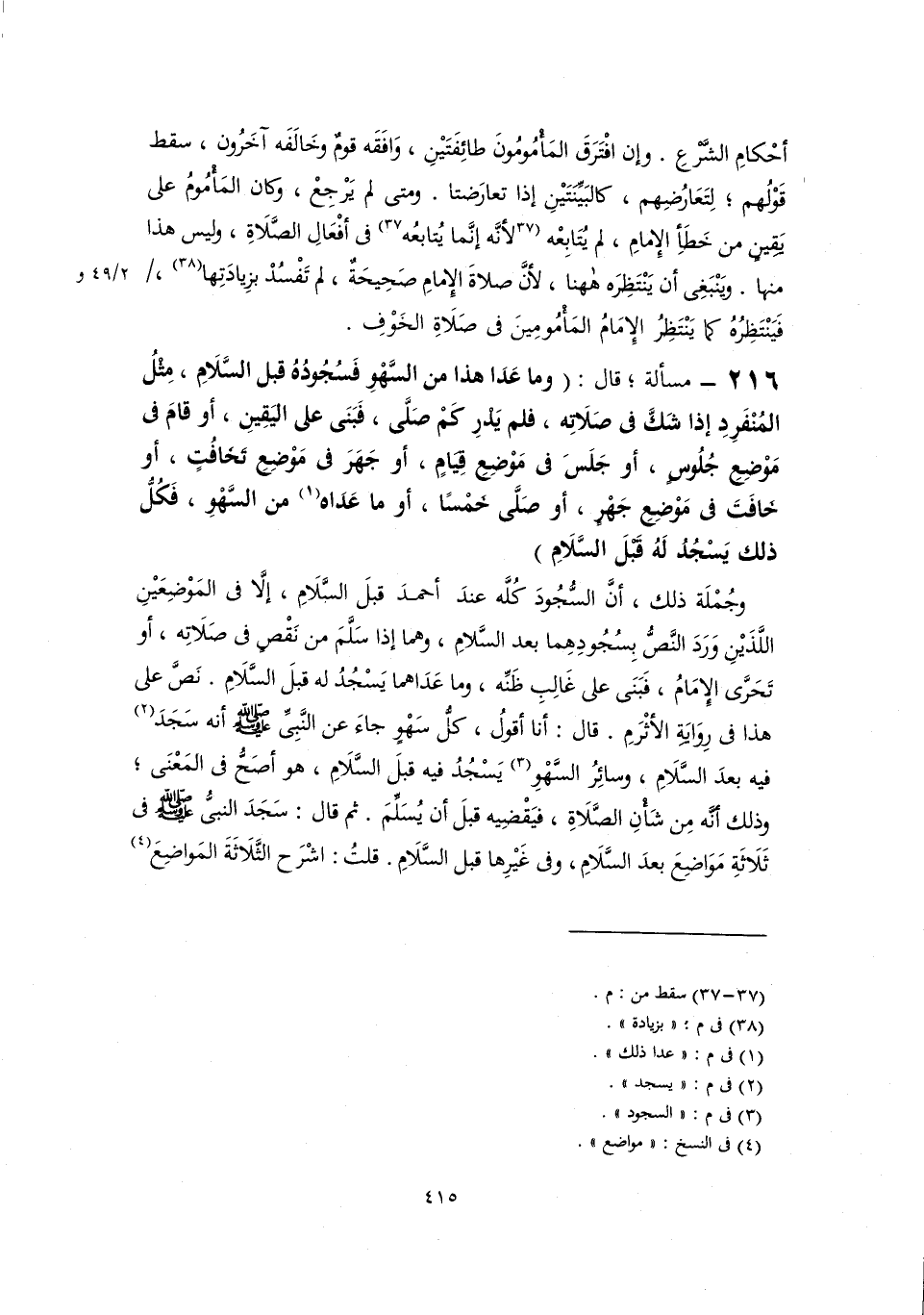 وجُمْلَة ذلك، أنَّ السُّجُودَ كُلَّه عندَ أحمدَ قبلَ السَّلَامِ، إلَّا في المَوْضِعَيْنِ اللَّذَيْنِ وَرَدَ النَّصُّ بِسُجُودِهِما بعد السَّلامِ، وهما إذا سَلَّمَ من نَقْصٍ في صَلَاتِه، أو تَحَرَّى الإِمَامُ، فَبَنَى على غَالِبِ ظَنِّه، وما عَدَاهما يَسْجُدُ له قبلَ السَّلَامِ. نَصَّ على هذا في رِوَايَةِ الأثْرَمِ. قال: أنا أقولُ، كلُّ سَهْوٍ جاءَ عن النَّبِيِّ -صلى اللَّه عليه وسلم- أنه سَجَدَ (٢) فيه بعدَ السَّلَامِ، وسائِرُ السَّهْوِ (٣) يَسْجُدُ فيه قبلَ السَّلَامِ، هو أصَحُّ في المَعْنَى؛ وذلك أنَّه مِن شَأْنِ الصَّلَاةِ، فيَقْضِيه قبلَ أن يُسَلِّمَ. ثم قال: سَجَدَ النبيُّ -صلى اللَّه عليه وسلم- في ثَلَاثَةِ مَوَاضِعَ بعدَ السَّلَامِ، وفى غَيْرِها قبل السَّلَامِ. قلتُ: اشْرَح الثَّلَاثَةَ المَواضِعَ (٤)
