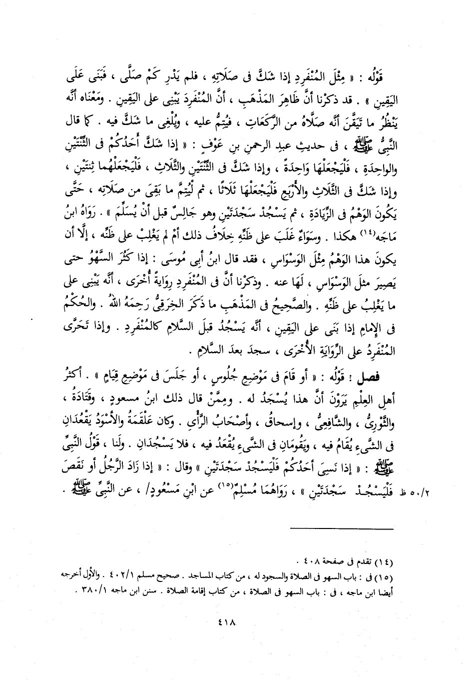 قَوْلُه: "مِثْلَ المُنْفَرِدِ إذا شَكَّ في صَلَاتِهِ، فلم يَدْرِ كَمْ صَلَّى، فَبَنَى عَلَى اليَقِينِ". قد ذكرْنا أنَّ ظَاهِرَ المَذْهَبِ، أنَّ المُنْفَرِدَ يَبْنِى على اليَقِينِ. ومَعْنَاه أنَّه يَنْظُرُ ما تَيَقَّنَ أنَّه صَلَّاهُ من الرَّكَعَاتِ، فيُتِمُّ عليه، ويُلْغِى ما شَكَّ فيه. كما قال النَّبِىُّ -صلى اللَّه عليه وسلم-، في حديثِ عبدِ الرحمنِ بنِ عَوْفٍ: "إذا شَكَّ أَحَدُكُمْ في الثِّنْتَيْنِ والواحِدَةِ، فَلْيَجْعَلْهَا وَاحِدَةً، وإذا شَكَّ في الثِّنْتَيْنِ والثَّلَاثِ، فَلْيَجْعَلْهُما ثِنتَيْنِ، وإذا شَكَّ في الثَّلَاثِ والأَرْبَعِ فَلْيَجْعَلْهَا ثَلَاثًا، ثم لْيُتِمَّ ما بَقِىَ من صَلَاتِه، حَتَّى يَكُونَ الوَهْمُ في الزِّيَادَةِ، ثم يَسْجُدْ سَجْدَتَيْنِ وهو جَالِسٌ قبل أنْ يُسَلِّمَ". رَوَاهُ ابنُ مَاجَه (١٤) هكذا. وسَوَاءٌ غَلَبَ على ظَنِّهِ خِلَافُ ذلك أمْ لم يَغْلِبْ على ظَنِّه، إلَّا أنَّ يكونَ هذا الوَهْمُ مِثْلَ الوَسْوَاسِ، فقد قال ابنُ أبِى مُوسَى: إذا كَثُرَ السَّهْوُ حتى يَصِيرَ مثلَ الوَسْوَاسِ، لَهَا عنه. وذكرْنا أنَّ في المُنْفَرِدِ رِوَايةً أُخْرَى، أنَّه يَبْنِى على ما يَغْلِبُ على ظَنِّهِ. والصَّحِيحُ في المَذْهَبِ ما ذَكَرَ الخِرَقِيُّ رَحِمَهُ اللهُ. والحُكْمُ في الإِمامِ إذا بَنَى على اليَقِينِ، أنَّه يَسْجُدُ قبلَ السَّلامِ كالمُنْفَرِدِ. وإذا تَحَرَّى المُنْفَرِدُ على الرِّوَايَةِ الأُخْرَى، سجدَ بعدَ السَّلامِ.