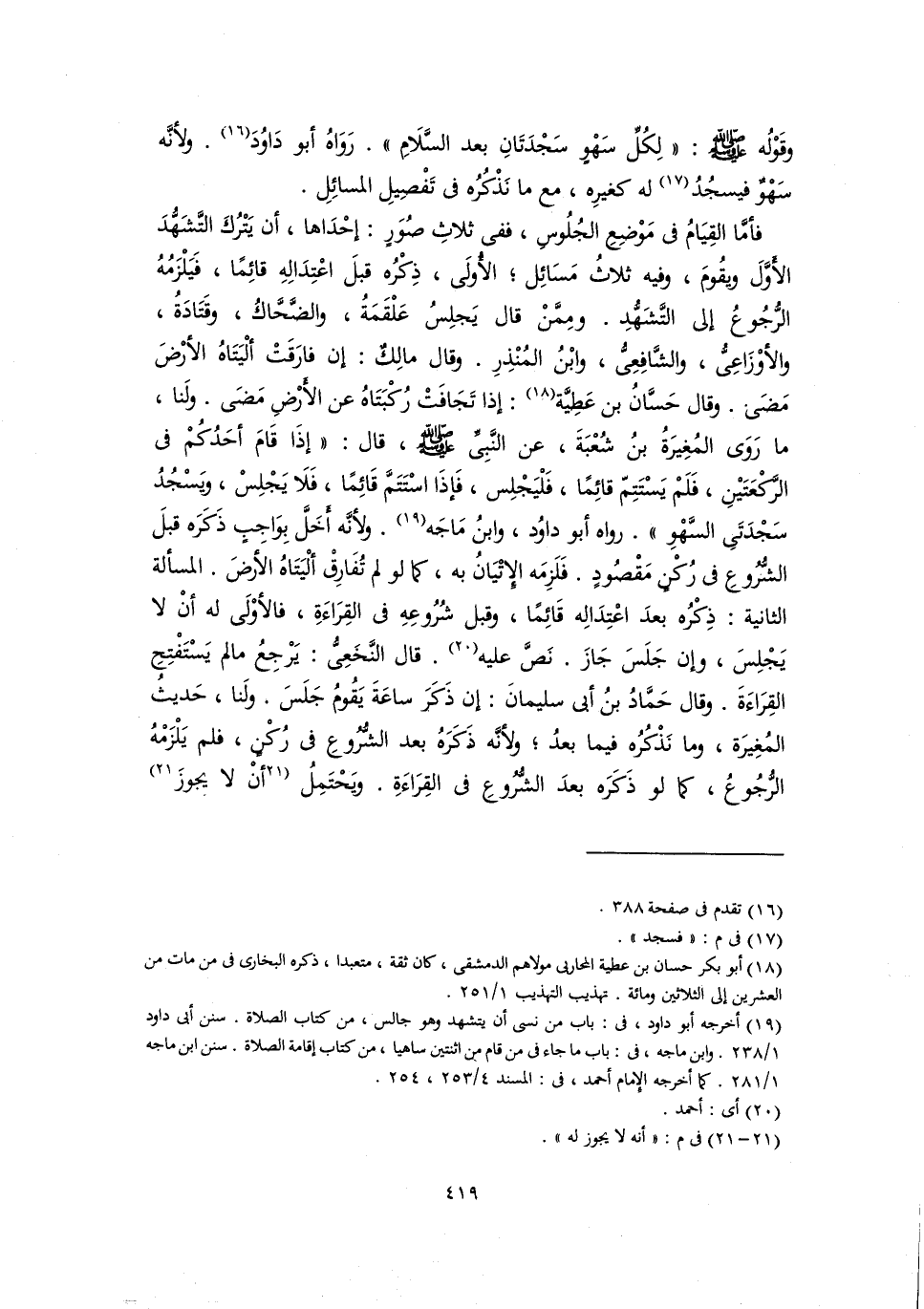 (١٩) أخرجه أبو داود، في: باب من نسى أن يتشهد وهو جالس، من كتاب الصلاة. سنن أبي داود ١/ ٢٣٨. وابن ماجه، في: باب ما جاء في من قام من اثنتين ساهيا، من كتاب إقامة الصلاة. سنن ابن ماجه ١/ ٢٨١. كما أخرجه الإمام أحمد، في: المسند ٤/ ٢٥٣، ٢٥٤.