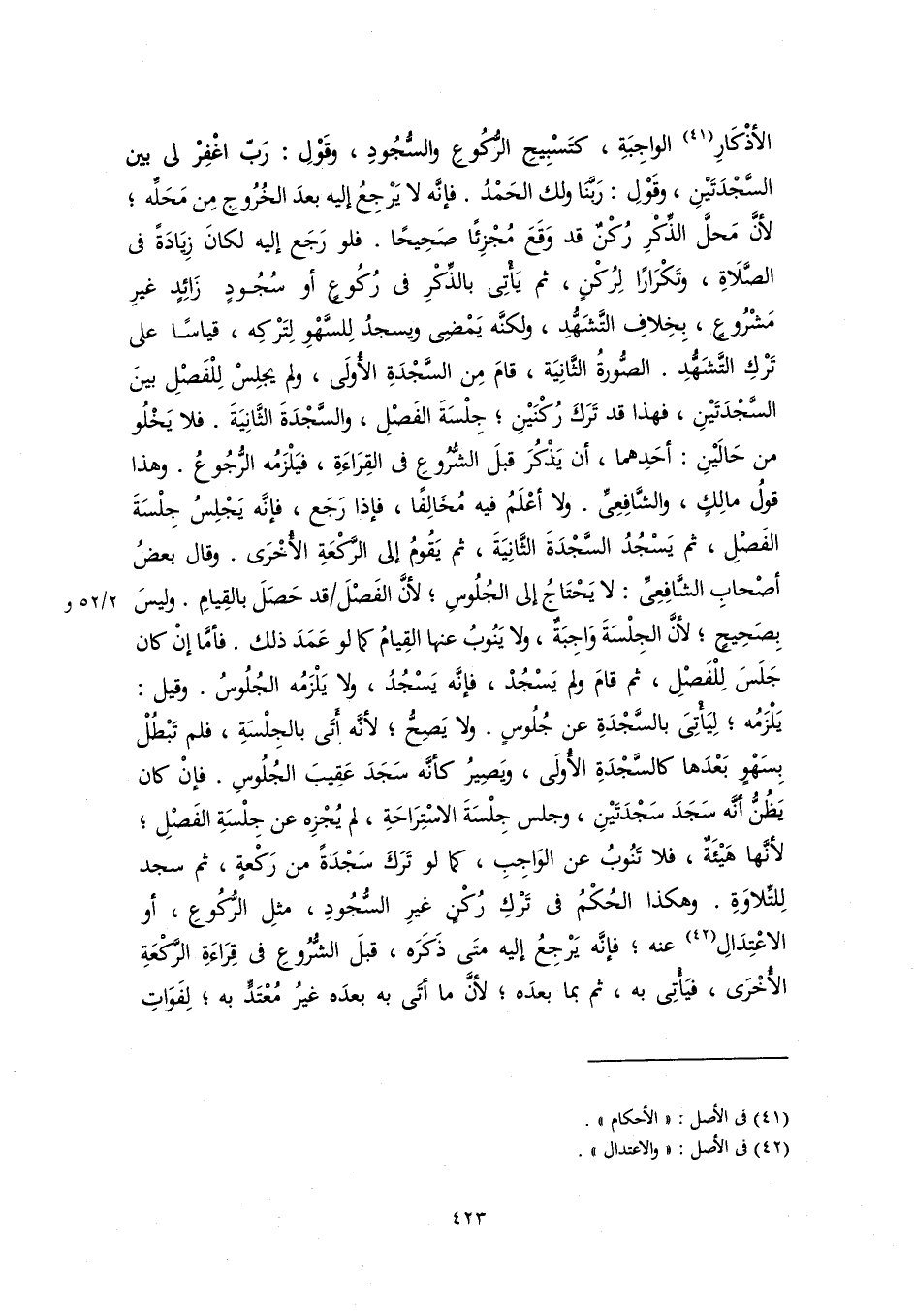 الأذْكَارِ (٤١) الواجِبَةِ، كتَسْبِيحِ الرُّكُوعِ والسُّجُودِ، وقَوْلِ: رَبّ اغْفِرْ لي بين السَّجْدَتَيْنِ، وقَوْلِ: رَبَّنَا ولك الحَمْدُ. فإنَّه لا يَرْجِعُ إليه بعدَ الخُرُوجِ مِن مَحَلِّه؛ لأنَّ مَحلَّ الذِّكْرِ رُكْنٌ قد وَقَعَ مُجْزِئًا صَحِيحًا. فلو رَجَع إليه لكانَ زِيَادَةً في الصَّلَاةِ، وتَكْرَارًا لِرُكْنٍ، ثم يَأْتِى بالذِّكْرِ في رُكُوعٍ أو سُجُودٍ زَائِدٍ غيرِ مَشْرُوعٍ، بِخِلافِ التَّشَهُّدِ، ولكنَّه يَمْضِي ويسجدُ لِلسَّهْوِ لِتَرْكِه، قياسًا على تَرْكِ التَّشَهُّدِ. الصُّورةُ الثَّانِيَة، قامَ مِن السَّجْدَةِ الأُولَى، ولم يجلِسْ لِلْفَصْلِ بينَ السَّجْدَتَيْنِ، فهذا قد تَرَكَ رُكْنَيْنِ؛ جِلْسَةَ الفَصْلِ، والسَّجْدَةَ الثَّانِيَةَ. فلا يَخْلُو من حَالَيْنِ: أحَدِهما، أن يَذْكُرَ قبلَ الشُّرُوعِ في القِرَاءَةِ، فيَلْزَمُه الرُّجُوعُ. وهذا قولُ مالِكٍ، والشَّافِعِيِّ. ولا أعْلَمُ فيه مُخَالِفًا، فإذا رَجَع، فإنَّه يَجْلِسُ جِلْسَةَ الفَصْلِ، ثم يَسْجُدُ السَّجْدَةَ الثَّانِيَةَ، ثم يَقُومُ إلى الرَّكْعَةِ الأُخْرَى. وقال بعضُ أصْحابِ الشَّافِعِيِّ: لا يَحْتَاجُ إلى الجُلُوسِ؛ لأنَّ الفَصْلَ قد حَصَلَ بالقِيامِ. وليسَ بِصَحِيحٍ؛ لأنَّ الجِلْسَةَ وَاجِبَةٌ، ولا يَنُوبُ عنها القِيامُ كما لو عَمَدَ ذلك. فأمَّا إنْ كان جَلَسَ لِلْفَصْلِ، ثم قامَ ولم يَسْجُدْ، فإنَّه يَسْجُدُ، ولا يَلْزَمُه الجُلُوسُ. وقيل: يَلْزَمُه؛ لِيَأْتِىَ بالسَّجْدَةِ عن جُلُوسٍ. ولا يَصِحُّ؛ لأنَّه أَتَى بالجِلْسَةِ، فلم تَبْطُلْ بِسَهْوٍ بَعْدَها كالسَّجْدَةِ الأُولَى، ويَصِيرُ كأنَّه سَجَدَ عَقِيبَ الجُلُوسِ. فإنْ كان يَظُنُّ أنَّه سَجَدَ سَجْدَتَيْنِ، وجلس جِلْسَةَ الاسْتِرَاحَةِ، لم يُجْزِه عن جِلْسَةِ الفَصْلِ؛ لأنَّها هَيْئَةٌ، فلا تَنُوبُ عن الوَاجِبِ، كما لو تَرَكَ سَجْدَةً من رَكْعةٍ، ثم سجد لِلتِّلاوَةِ. وهكذا الحُكْمُ في تَرْكِ رُكْنٍ غيرِ السُّجُودِ، مثلِ الرُّكُوعِ، أو الاعْتِدَالِ (٤٢) عنه؛ فإنَّه يَرْجِعُ إليه متَى ذَكَرَه، قبلَ الشُّرُوعِ في قِرَاءَةِ الرَّكْعَةِ الأُخْرَى، فيَأْتِى به، ثم بما بعدَه؛ لأنَّ ما أتَى به بعدَه غيرُ مُعْتَدٍّ به؛ لِفَوَاتِ