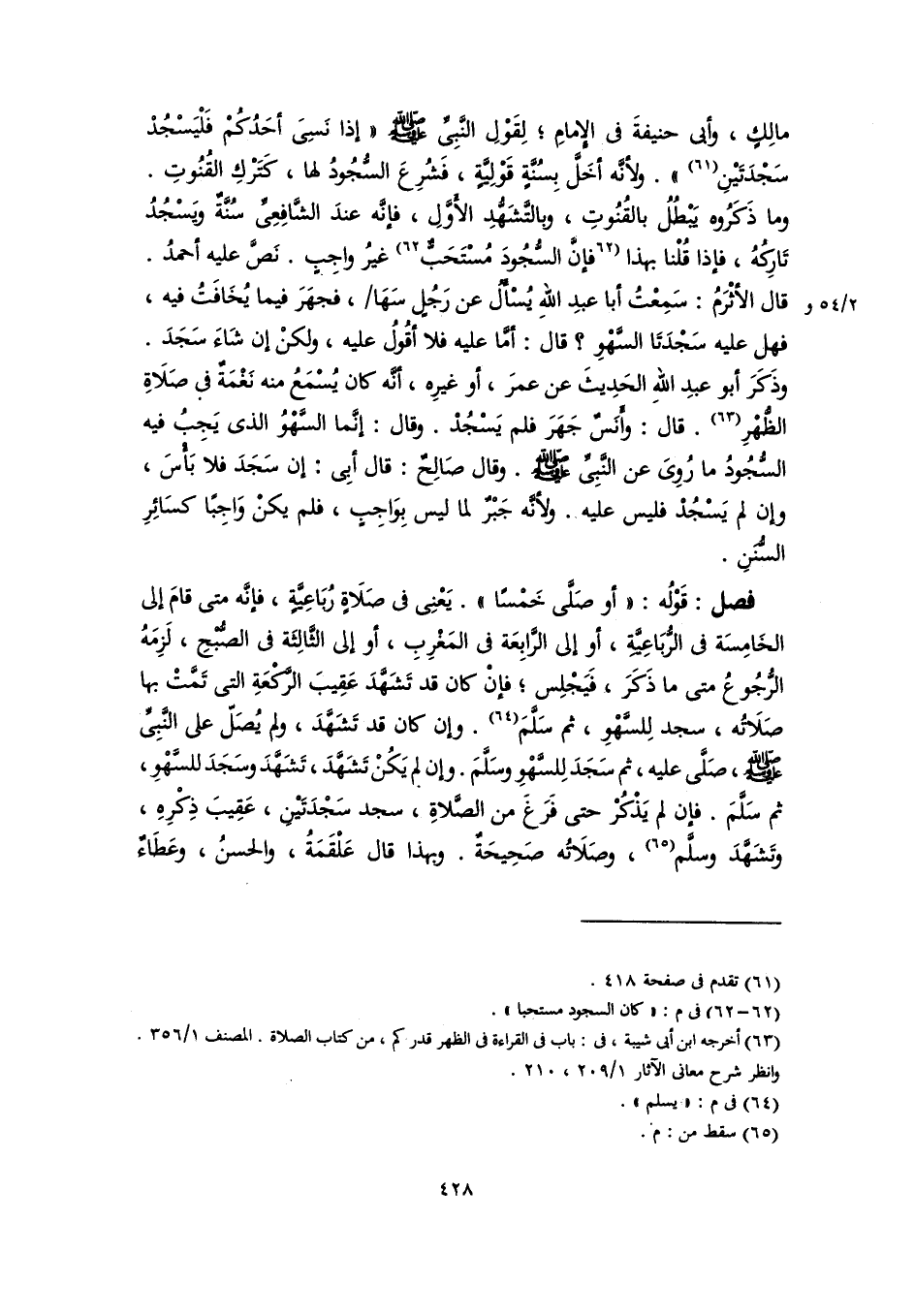 فصل: قَوْلُه: "أو صَلَّى خَمْسًا". يَعْنِى في صَلَاةٍ رُبَاعِيَّةٍ، فإنَّه متى قامَ إلى الخَامِسَة في الرُّبَاعِيَّةِ، أو إلى الرَّابِعَة في المَغْرِبِ، أو إلى الثَّالِثَة في الصُّبْحِ، لَزِمَهُ الرُّجُوعُ متى ما ذَكَرَ، فَيَجْلِس؛ فإنْ كان قد تَشَهَّدَ عَقِيبَ الرَّكْعَةِ التي تَمَّتْ بها صَلَاتُه، سجد لِلسَّهْوِ، ثم سَلَّمَ (٦٤). وإن كان قد تَشَهَّدَ، ولم يُصَلّ على النَّبِيِّ -صلى اللَّه عليه وسلم-، صَلَّى عليه، ثم سَجَدَ لِلسَّهْوِ وسَلَّمَ. وإن لم يَكُنْ تَشَهَّدَ، تَشَهَّدَ وسَجَدَ للسَّهْوِ، ثم سَلَّمَ. فإن لم يَذْكُرْ حتى فَرَغَ من الصَّلاةِ، سجد سَجْدَتَيْنِ، عَقِيبَ ذِكْرِهِ، وتَشَهَّدَ وسلَّم (٦٥)، وصَلَاتُه صَحِيحَةٌ. وبهذا قال عَلْقَمَةُ، والحسنُ، وعَطَاءٌ