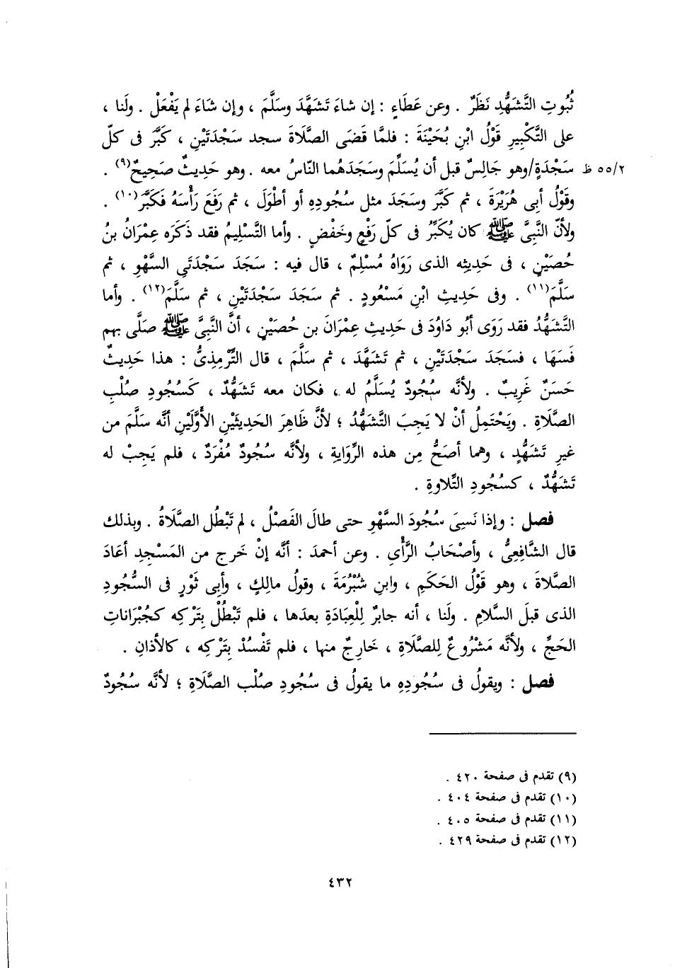 ثُبُوتِ التَّشَهُّدِ نَظَرٌ. وعن عَطَاءٍ: إن شاءَ تَشَهَّدَ وسَلَّمَ، وإن شَاءَ لم يَفْعَلْ. ولَنا، على التَّكْبِيرِ قَوْلُ ابْنِ بُحَيْنَةَ: فلمَّا قَضَى الصَّلَاةَ سجد سَجْدَتَيْنِ، كَبَّرَ في كلّ سَجْدَةٍ وهو جَالِسٌ قبل أن يُسَلِّمَ وسَجَدَهُما النّاسُ معه. وهو حَدِيثٌ صَحِيحٌ (٩). وقَوْلُ أبِى هُرَيْرَةَ، ثم كَبَّرَ وَسَجَدَ مثل سُجُودِهِ أو أطْوَلَ، ثم رَفَعَ رَأْسَهُ فَكَبَّرَ (١٠). ولأنّ النَّبِىَّ -صلى اللَّه عليه وسلم- كان يُكَبِّرُ في كلّ رَفْعٍ وخَفْضٍ. وأما التَّسْلِيمُ فقد ذَكَرَه عِمْرَانُ بنُ حُصَيْنٍ، في حَدِيثِه الذي رَوَاهُ مُسْلِمٌ، قال فيه: سَجَدَ سَجْدَتَيِ السَّهْوِ، ثم سَلَّمَ (١١). وفي حَدِيثِ ابْنِ مَسْعُودٍ. ثم سَجَدَ سَجْدَتَيْنِ، ثم سَلَّمَ (١٢). وأما التَّشَهُّدُ فقد رَوَى أبُو دَاوُدَ في حَدِيثِ عِمْرَانَ بن حُصَيْنٍ، أنَّ النَّبِيَّ -صلى اللَّه عليه وسلم- صَلَّى بهم فَسَهَا، فسَجَدَ سَجْدَتَيْنِ، ثم تَشَهَّدَ، ثم سَلَّمَ، قال التِّرْمِذِىُّ: هذا حَدِيثٌ حَسَنٌ غَرِيبٌ. ولأنَّه سُجُودٌ يُسَلَّمُ له، فكان معه تَشَهُّدٌ، كَسُجُودِ صُلْبِ الصَّلَاةِ. ويَحْتَمِلُ أنْ لا يَجِبَ التَّشَهُّدُ؛ لأنَّ ظَاهِرَ الحَدِيثَيْنِ الأَوَّلَيْنِ أنَّه سَلَّمَ من غيرِ تَشَهُّدٍ، وهما أصَحُّ مِن هذه الرِّوَايةِ، ولأنَّه سُجُودٌ مُفرَدٌ، فلم يَجِبْ له تَشَهُّدٌ، كسُجُودِ التِّلاوةِ.