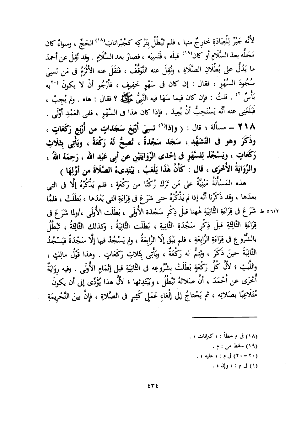 لأنَّه جَبْرٌ لِلْعِبَادَةِ خَارِجٌ منها، فلم تَبْطُلْ بِتَرْكِه كجُبْراناتِ (١٨) الحَجِّ، وسواءٌ كان مَحَلُّه بعدَ السَّلَامِ أو كان (١٩) قبلَه، فَنَسِيَه، فصارَ بعد السَّلَامِ. وقد نُقِلَ عن أحمدَ ما يَدُلُّ على بُطْلَانِ الصَّلَاةِ، ونُقِلَ عنه التَّوَقُّفُ، فنَقَلَ عنه الأثْرَمُ في مَن نَسِىَ سُجُودَ السَّهْوِ، فقال: إن كان في سَهْوٍ خَفِيفٍ، فأرْجُو أنْ لا يكونَ [به بَأْسٌ] (٢٠). قلتُ: فإن كان فيما سَهَا فيه النَّبِىُّ -صلى اللَّه عليه وسلم-؟ فقال: هاه. ولم يُجِبْ، فَبَلَغَنِى عنه أنَّه يَسْتَحِبُّ أنْ يُعِيدَ. فإذا كان هذا في السَّهْوِ، ففى العَمْدِ أوْلَى.