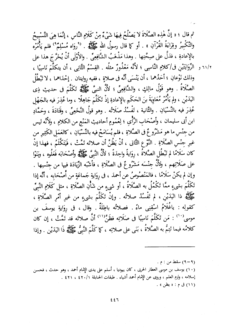 ثم قال؛ "إنَّ هذِه الصَّلَاةَ لا يَصْلُحُ فِيهَا شَىْءٌ مِنْ كَلَامِ النَّاسِ، إنَّمَا هِىَ التَّسْبِيحُ والتَّكْبِيرُ وقِرَاءَةُ القُرْآنِ". أو كما قال رسولُ اللهِ -صلى اللَّه عليه وسلم-. [روَاه مُسْلِمٌ] (٩) فلم يَأْمُرْه بالإِعادةِ، فدَلَّ على صِحَّتِها. وهذا مَذْهَبُ الشَّافِعِىِّ. والأوْلَى أنْ يُخَرَّجَ هذا على الرِّوَايَتَيْنِ في كلامِ النَّاسِى؛ لأنَّه مَعْذُورٌ مثلُه. القِسْمُ الثَّانِى، أن يتكلَّمَ نَاسِيًا، وذلك نَوْعانِ؛ أحَدُهما، أن يَنْسَى أنَّه في صلاةٍ، ففيه رِوايتان. إحْدَاهما, لا تَبْطُلُ الصَّلَاةُ. وهو قَوْلُ مالِكٍ، والشَّافِعِىِّ؛ لأنَّ النبيَّ -صلى اللَّه عليه وسلم- تَكَلَّمَ في حديثِ ذِى اليَدَيْنِ، ولم يَأْمُرْ مُعَاوِيَةَ بنَ الحَكَمِ بالإِعادةِ إذْ تَكَلَّمَ جَاهِلًا، وما عُذِرَ فيه بالجَهْلِ عُذِرَ فيه بالنِّسْيَانِ. والثَّانية، تَفْسُدُ صَلَاتُه. وهو قولُ النَّخَعِىِّ، وقَتَادَةَ، وحَمَّادِ بن أبي سليمان، وأصْحَابِ الرَّأْىِ؛ لِعُمُومِ أحاديثِ المَنْعِ من الكلامِ، ولأنَّه ليس من جِنْسِ ما هو مَشْرُوعٌ في الصَّلاةِ، فلم يُسَامَحْ فيه بالنِّسْيَانِ، كالعَمَلِ الكَثِيرِ من غيرِ جِنْسِ الصَّلَاةِ. النَّوْع الثَّانى، أنْ يَظُنَّ أن صلاتَه تَمَّتْ، فَيَتَكَّلَمُ، فهذا إنْ كان سَلَامًا لم تَبْطُل الصَّلاةُ، رِوَايةً واحِدَةً؛ لأنَّ النَّبِىَّ -صلى اللَّه عليه وسلم- وأصْحَابَه فَعَلُوه، وبَنَوْا على صَلَاتِهم، ولأنَّ جِنْسَه مَشْرُوعٌ في الصَّلَاةِ، فأشْبَه الزِّيَادَة فيها من جنْسِها. وإن لم يكنْ سَلَامًا، فالمَنْصُوصُ عن أحمدَ، في رِوَايةِ جَماعَةٍ من أَصْحَابِه, أنَّه إذا تَكَلَّمَ بشيءٍ ممَّا تَكْمُلُ به الصَّلَاةُ، أو شيءٍ من شَأْنِ الصَّلَاةِ، مثلِ كَلَامِ النَّبِيِّ -صلى اللَّه عليه وسلم- ذا اليَدَيْنِ، لم تَفْسُدْ صلاتُه. وإنْ تَكَلَّمَ بشيءٍ من غيرِ أمْرِ الصَّلَاةِ، كقولِه: يا غُلَامُ اسْقِنِى ماءً. فصلاتُه باطِلَةٌ. وقال، في رِوَايةِ يوسفَ بن موسى (١٠): مَن تَكَلَّمَ نَاسِيًا في صَلَاتِه فظَنَّ (١١) أنَّ صلاتَه قد تَمَّتْ، إن كان كلامُه فيما تَتِمُّ به الصَّلاةُ، بَنَى على صلاتِه، كما كَلَّمَ النَّبِىُّ -صلى اللَّه عليه وسلم- ذَا اليَدَيْن. وإذا