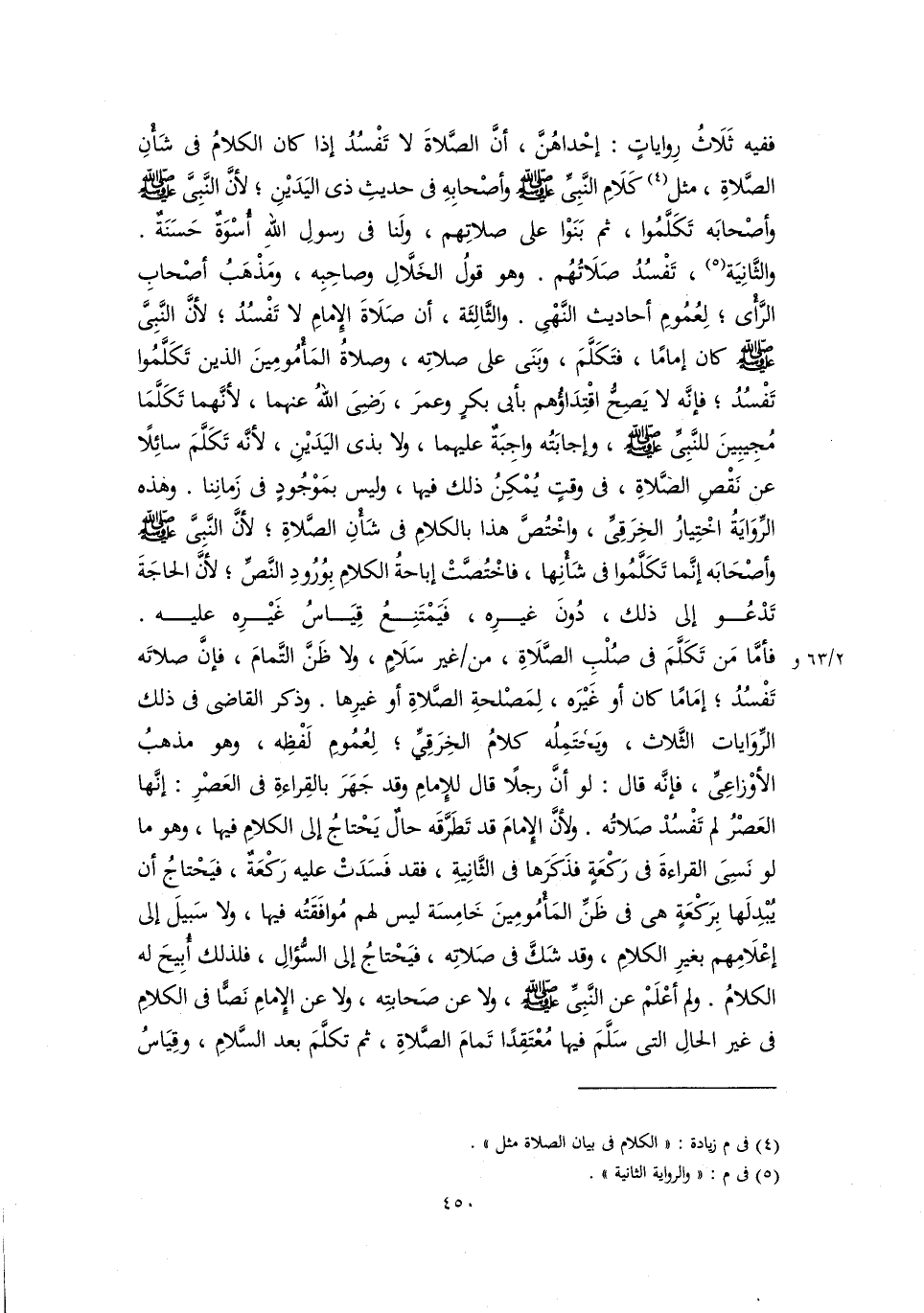 ففيه ثَلَاثُ رِواياتٍ: إحْداهُنَّ، أنَّ الصَّلاةَ لا تَفْسُدُ إذا كان الكلامُ في شَأْنِ الصَّلاةِ، مثل (٤) كَلَامِ النَّبِيِّ -صلى اللَّه عليه وسلم- وأصْحابِهِ في حديثِ ذى اليَدَيْنِ؛ لأنَّ النَّبِىَّ -صلى اللَّه عليه وسلم- وأصْحابَه تَكَلَّمُوا، ثم بَنَوْا على صلاتِهم، ولَنا في رسولِ اللهِ أُسْوَةٌ حَسَنَةٌ. والثَّانِيَة (٥)، تَفْسُدُ صَلَاتُهُم. وهو قولُ الخَلَّالِ وصاحِبِه، ومَذْهَبُ أصْحابِ الرَّأْى؛ لِعُمُومِ أحاديث النَّهْىِ. والثَّالِثَة، أن صَلَاةَ الإِمامِ لا تَفْسُدُ؛ لأنَّ النَّبِىَّ -صلى اللَّه عليه وسلم- كان إمامًا، فتَكَلَّمَ، وبَنَى على صلاتِه، وصلاةُ المَأْمُومِينَ الذين تَكَلَّمُوا تَفْسُدُ؛ فإنَّه لا يَصِحُّ اقْتِدَاؤُهم بأبى بكرٍ وعمرَ، رَضِىَ اللهُ عنهما، لأنَّهما تَكَلَّمَا مُجِيبِينَ للنَّبِىِّ -صلى اللَّه عليه وسلم-، وإجابَتُه واجِبَةٌ عليهما، ولا بذى اليَدَيْنِ، لأنَّه تَكَلَّمَ سائِلًا عن نَقْصِ الصَّلاةِ، في وقتٍ يُمْكِنُ ذلك فيها، وليس بمَوْجُودٍ في زَمانِنا. وهذه الرِّوَايَةُ اخْتِيارُ الخِرَقِىِّ، واخْتُصَّ هذا بالكلامِ في شَأْنِ الصَّلاةِ؛ لأنَّ النَّبِىَّ -صلى اللَّه عليه وسلم- وأصْحَابَه إنَّما تَكَلَّمُوا في شَأْنِها، فاخْتُصَّتْ إباحةُ الكلامِ بِوُرُودِ النَّصِّ؛ لأنَّ الحاجَةَ تَدْعُو إلى ذلك، دُونَ غيرِه، فَيَمْتَنِعُ قِيَاسُ غَيْرِه عليه. فأمَّا مَن تَكَلَّمَ في صُلْبِ الصَّلَاةِ، من غير سَلَامٍ، ولا ظَنَّ التَّمامَ، فإنَّ صلاتَه تَفْسُدُ؛ إمَامًا كان أو غَيْرَه، لِمَصْلحةِ الصَّلاةِ أو غيرِها. وذكر القاضي في ذلك الرِّوَايات الثَّلاث، ويَحْتَمِلُه كلامُ الخِرَقِيِّ؛ لِعُمُومِ لَفْظِه، وهو مذهبُ الأوْزاعِىِّ، فإنَّه قال: لو أنَّ رجلًا قال للإِمامِ وقد جَهَرَ بالقِراءةِ في العَصْرِ: إنَّها العَصْرُ لم تَفْسُدْ صَلاتُه. ولأنَّ الإِمامَ قد تَطَرَّقَه حالٌ يَحْتاجُ إلى الكلامِ فيها، وهو ما لو نَسِىَ القراءةَ في رَكْعَةٍ فذَكَرَها في الثَّانِيةِ، فقد فَسَدَتْ عليه رَكْعَةٌ، فيَحْتاجُ أن يُبْدِلَها بِرَكْعَةٍ هي في ظَنِّ المَأْمُومِينَ خَامِسَة ليس لهم مُوافَقَتُه فيها، ولا سَبيلَ إلى إعْلَامِهم بغيرِ الكلامِ، وقد شَكَّ في صَلاتِه، فيَحْتاجُ إلى السُّؤالِ، فلذلك أُبِيحَ له الكلامُ. ولم أعْلَمْ عن النَّبِيِّ -صلى اللَّه عليه وسلم-، ولا عن صَحابتِه، ولا عن الإِمامِ نَصًّا في الكلامِ في غير الحالِ التي سَلَّمَ فيها مُعْتَقِدًا تَمامَ الصَّلاةِ، ثم تكلَّمَ بعد السَّلامِ، وقِيَاسُ