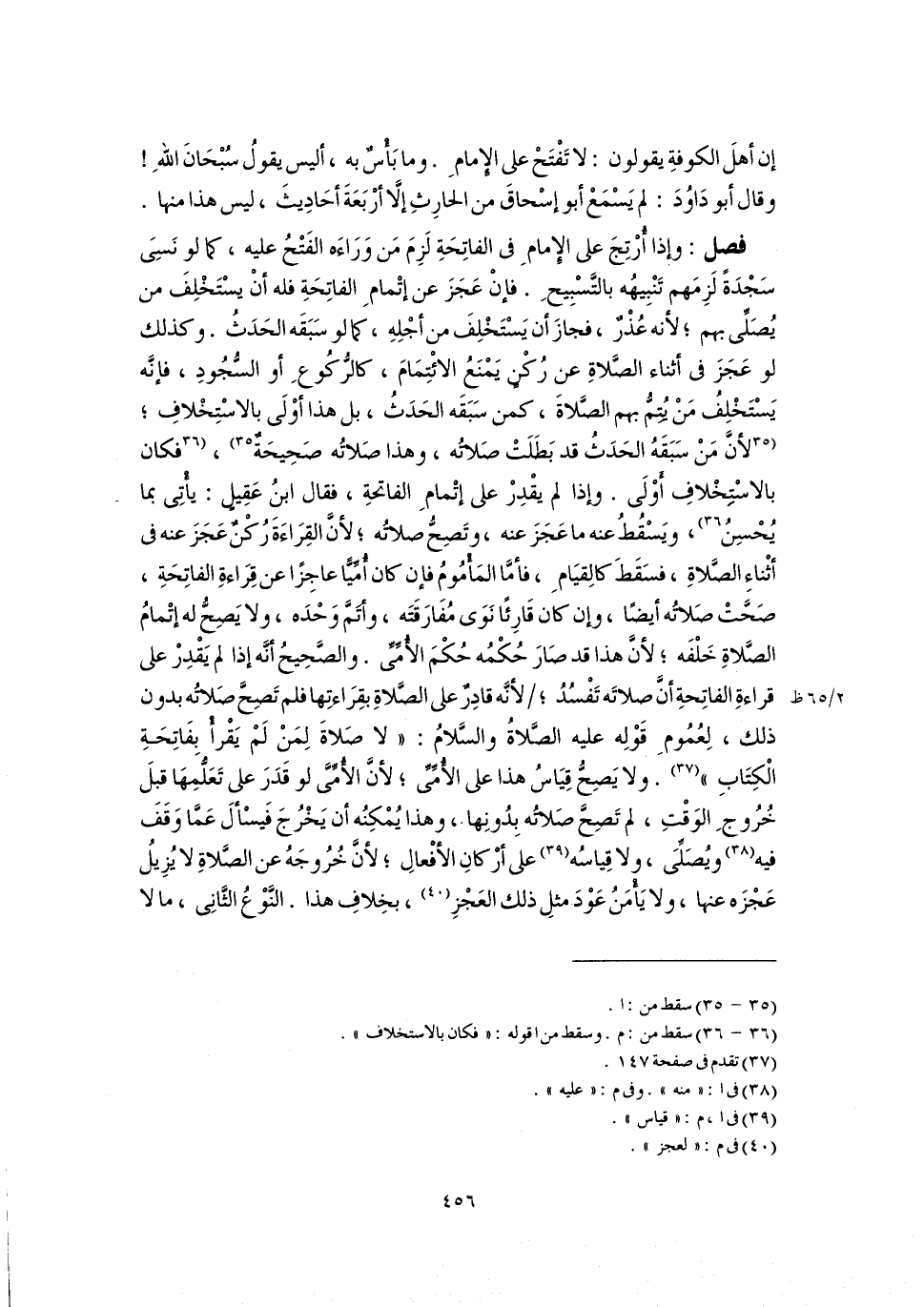 فصل: وإذا أُرْتِجَ على الإِمامِ في الفاتِحَةِ لَزِمَ مَن وَرَاءَه الفَتْحُ عليه، كما لو نَسِىَ سَجْدَةً لَزِمَهم تَنْبِيهُه بالتَّسْبِيحِ. فإنْ عَجَزَ عن إتْمامِ الفاتِحَةِ فله أنْ يسْتَخْلِفَ من يُصَلِّى بهم؛ لأنه عُذْرٌ، فجازَ أن يَسْتَخْلِفَ من أجْلِهِ، كما لو سَبَقَه الحَدَثُ. وكذلك لو عَجَزَ في أثناء الصَّلاةِ عن رُكْنٍ يَمْنَعُ الائْتِمَامَ، كالرُّكُوعِ أو السُّجُودِ، فإنَّه يَسْتَخْلِفُ مَنْ يُتِمُّ بهم الصَّلاةَ، كمن سَبَقَه الحَدَثُ، بل هذا أوْلَى بالاسْتِخْلافِ؛ [لأنَّ مَنْ سَبَقَهُ الحَدَثُ قد بَطَلَتْ صَلاتُه، وهذا صَلاتُه صَحِيحَةٌ] (٣٥)، [فكان بالاسْتِخْلافِ أَوْلَى. وإذا لم يقْدِرْ على إتْمامِ الفاتحةِ، فقال ابنُ عَقِيلٍ: يأْتِى بما يُحْسِنُ] (٣٦)، ويَسْقُطُ عنه ما عَجَزَ عنه، وتَصِحُّ صلاتُه؛ لأنَّ القِرَاءَةَ رُكْنٌ عَجَزَ عنه في أثْناءِ الصَّلاةِ، فسَقَطَ كالِقيَامِ، فأمَّا المَأْمُومُ فإن كان أُمِّيًّا عاجِزًا عن قِرَاءةِ الفاتِحَةِ، صَحَّتْ صَلاتُه أيضًا، وإن كان قَارِئًا نَوَى مُفَارَقَتَه، وأتَمَّ وَحْدَه، ولا يَصِحُّ له إتْمامُ الصَّلاةِ خَلْفَه؛ لأنَّ هذا قد صَارَ حُكْمُه حُكْمَ الأُمِّيِّ. والصَّحِيحُ أنَّه إذا لم يَقْدِرْ على قراءةِ الفاتِحةِ أنَّ صلاتَه تَفْسُدُ؛ لأنَّه قادِرٌ على الصَّلاةِ بقِرَاءتِها فلم تَصِحَّ صَلاتُه بدون ذلك، لِعُمُومِ قَوْلِه عليه الصَّلاةُ والسَّلامُ: "لا صَلاةَ لِمَنْ لَمْ يَقْرأْ بِفَاتِحَةِ الْكِتَابِ" (٣٧). ولا يَصِحُّ قِيَاسُ هذا على الأُمِّيِّ؛ لأنَّ الأُمِّيَّ لو قَدَرَ على تَعَلُّمِهَا قبلَ خُرُوجِ الوَقْتِ، لم تَصِحَّ صَلاتُه بِدُونِها، وهذا يُمْكِنُه أن يَخْرُجَ فَيسْألَ عَمَّا وَقَفَ فيه (٣٨) ويُصَلِّىَ، ولا قِياسُه (٣٩) على أرْكانِ الأفْعالِ؛ لأنَّ خُرُوجَهُ عن الصَّلاةِ لا يُزِيلُ عَجْزَه عنها، ولا يَأْمَنُ عَوْدَ مثلِ ذلك العَجْزِ (٤٠)، بخِلافِ هذا. النَّوْعُ الثَّانِي، ما لا