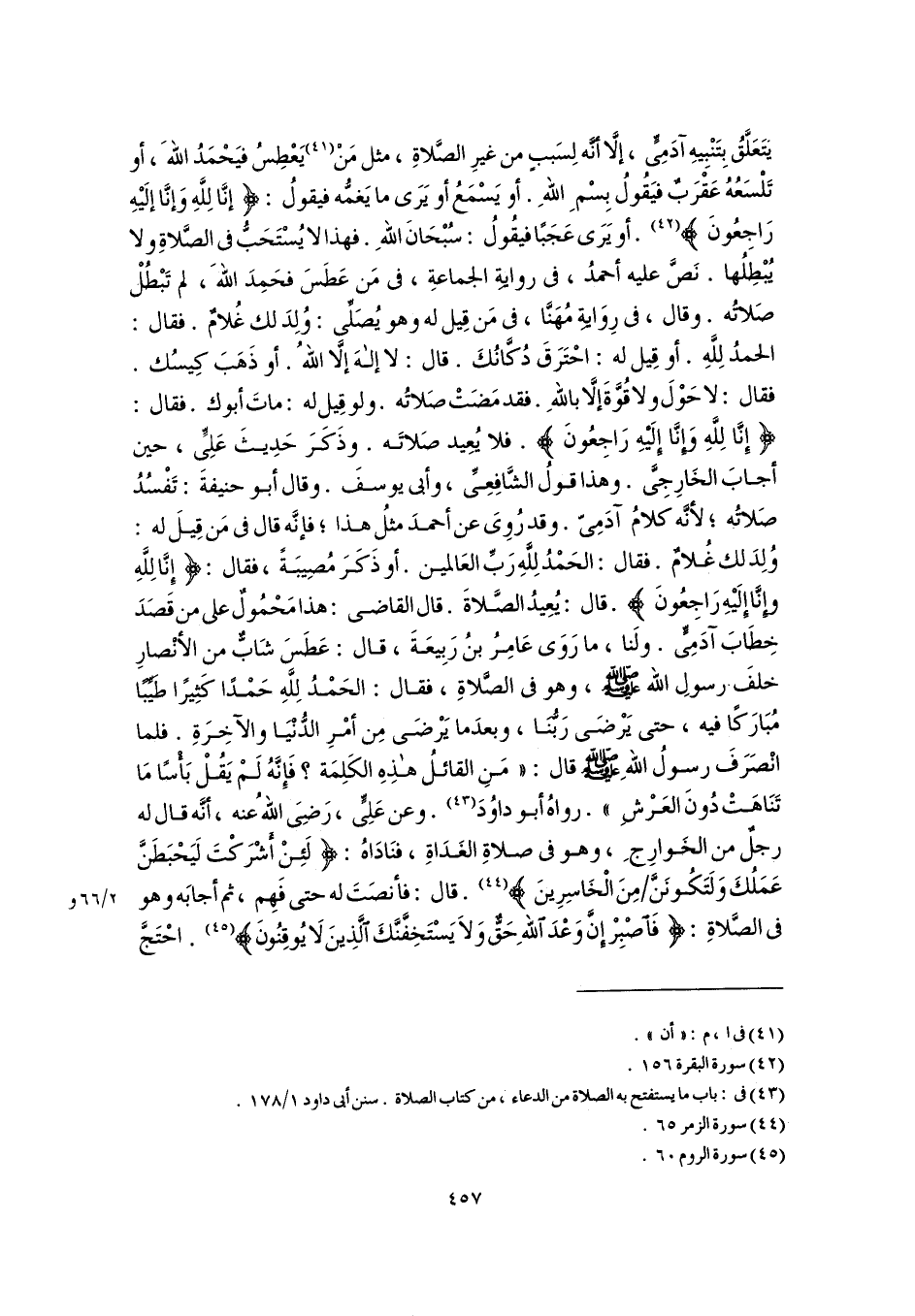 يتَعَلَّقُ بِتَنْبِيهِ آدَمِيٍّ، إلَّا أنَّه لِسَببٍ من غيرِ الصَّلاةِ، مثل مَنْ (٤١) يَعْطِسُ فيَحْمَدُ اللهَ، أو تَلْسَعُهُ عَقْرَبٌ فيَقُولُ بِسْمِ اللهِ. أو يَسْمَعُ أو يَرَى ما يَغمُّه فيقولُ: {إِنَّا لِلَّهِ وَإِنَّا إِلَيْهِ رَاجِعُونَ} (٤٢). أو يَرَى عَجَبًا فيقُولُ: سُبْحَانَ اللهِ. فهذا لا يُسْتَحَبُّ في الصَّلاةِ ولا يُبْطِلُها. نَصَّ عليه أحمدُ، في روايةِ الجماعةِ، في مَن عَطَسَ فحَمِدَ اللهَ، لم تَبْطُلْ صَلاتُه. وقال، في رِوَايةِ مُهَنَّا، في مَن قِيل له وهو يُصَلِّي: وُلِدَ لك غُلامٌ. فقال: الحمدُ لِلَّهِ. أو قِيل له: احْتَرَقَ دُكَّانُكَ. قال: لا إلهَ إلَّا اللهُ. أو ذَهَبَ كِيسُك. فقال: لا حَوْلَ ولا قُوَّةَ إلَّا باللهِ. فقد مَضَتْ صَلاتُه. ولو قِيل له: ماتَ أبوك. فقال: {إِنَّا لِلَّهِ وَإِنَّا إِلَيْهِ رَاجِعُونَ}. فلا يُعِيد صَلاتَه. وذَكَرَ حَدِيثَ عَلِيٍّ، حين أجابَ الخَارِجِيَّ. وهذا قولُ الشَّافِعِيِّ، وأبى يوسفَ. وقال أبو حنيفةَ: تَفْسُدُ صَلاتُه؛ لأنَّه كلامُ آدَمِيّ. وقد رُوِىَ عن أحمدَ مثلُ هذا؛ فإنَّه قال في مَن قِيلَ له: وُلِدَ لك غُلامٌ. فقال: الحَمْدُ لِلهِ رَبِّ العَالمين. أو ذَكَرَ مُصِيبَةً، فقال: {إِنَّا لِلَّهِ وَإِنَّا إِلَيْهِ رَاجِعُونَ}. قال: يُعِيدُ الصَّلاةَ. قال القاضي: هذا مَحْمُولٌ على من قَصَدَ خِطَابَ آدَمِيٍّ. ولَنا، ما رَوَى عَامِرُ بنُ رَبِيعَةَ، قال: عَطَسَ شَابٌّ من الأنْصارِ خلفَ رسولِ اللَّه -صلى اللَّه عليه وسلم-، وهو في الصَّلاةِ، فقال: الحَمْدُ لِلَّهِ حَمْدًا كَثِيرًا طَيِّبًا مُبَارَكًا فيه، حتى يَرْضَى رَبُّنَا، وبعدَما يَرْضَى مِن أمْرِ الدُّنْيَا والآخِرَةِ. فلما انْصَرَفَ رسولُ اللهِ -صلى اللَّه عليه وسلم- قال: "مَنِ القائلُ هذِهِ الكَلِمَة؟ فَإِنَّهُ لَمْ يَقُلْ بَأْسًا مَا تَنَاهَتْ دُونَ العَرْشِ". رواهُ أبو داوُدَ (٤٣). وعن عَلِيٍّ، رَضِىَ اللهُ عنه، أنَّه قال له رجلٌ من الخَوارِجِ، وهو في صلاةِ الغَدَاةِ، فنَادَاهُ: {لَئِنْ أَشْرَكْتَ لَيَحْبَطَنَّ عَمَلُكَ وَلَتَكُونَنَّ مِنَ الْخَاسِرِينَ} (٤٤). قال: فأنصَتَ له حتى فهِم، ثم أجابَه وهو في الصَّلاةِ: {فَاصْبِرْ إِنَّ وَعْدَ اللَّهِ حَقٌّ وَلَا يَسْتَخِفَّنَّكَ الَّذِينَ لَا يُوقِنُونَ} (٤٥). احْتَجَّ
