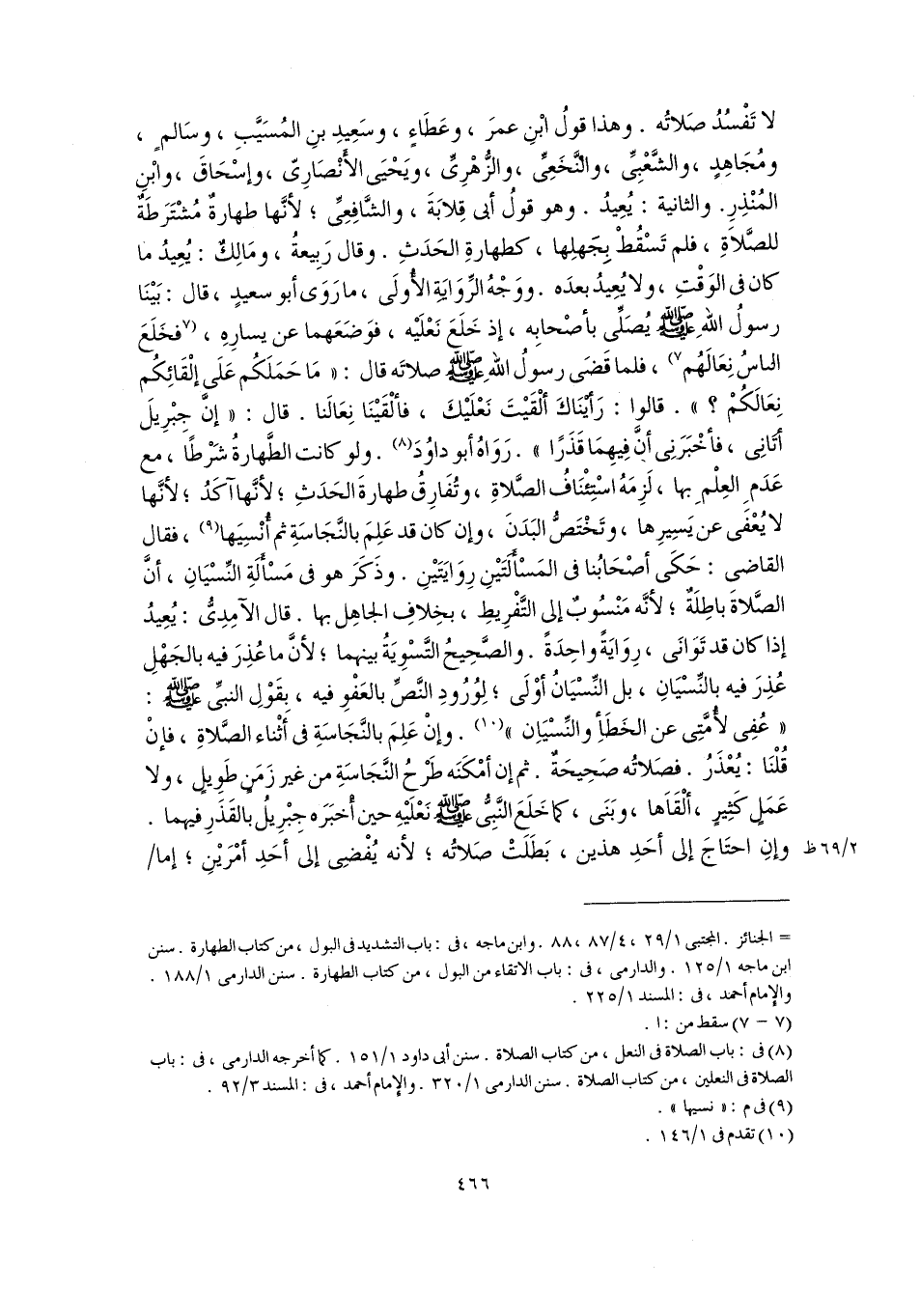 لا تَفْسُدُ صَلاتُه. وهذا قولُ ابْنِ عمرَ، وعَطَاءٍ، وسَعِيدِ بنِ المُسَيَّبِ، وسَالمٍ، ومُجَاهِدٍ، والشَّعْبِيِّ، والنَّخَعِيِّ، والزُّهْرِيِّ، ويَحْيَى الأَنْصَارِيّ، وإسْحَاقَ، وابْنِ المُنْذِرِ. والثانية: يُعِيدُ. وهو قولُ أبي قِلابَةَ، والشَّافِعِيِّ؛ لأنَّها طهارةٌ مُشْتَرَطَةٌ للصَّلَاةِ، فلم تَسْقُطْ بِجَهلِها، كطهارةِ الحَدَثِ. وقال رَبِيعةُ، ومَالِكٌ: يُعِيدُ ما كان في الوَقْتِ، ولا يُعِيدُ بعدَه. ووَجْهُ الرِّوَايَةِ الأُولَى، ما رَوَى أبو سعيدٍ، قال: بَيْنَا رسولُ اللهِ -صلى اللَّه عليه وسلم- يُصَلِّي بأصْحابِه، إذ خَلَعَ نَعْلَيْه، فوَضَعَهما عن يسارِهِ، [فخَلَعَ الناسُ نِعَالَهُم] (٧)، فلما قَضَى رسولُ اللهِ -صلى اللَّه عليه وسلم- صلاتَه قال: "مَا حَمَلَكُم عَلَى إلْقَائِكُم نِعَالَكُمْ؟ ". قالوا: رَأيْنَاكَ ألْقَيْتَ نَعْلَيْكَ، فألْقَيْنَا نِعَالَنا. قال: "إن جِبْرِيلَ أتَانِى، فأخْبَرَنِى أنَّ فِيهِمَا قَذَرًا". رَوَاهُ أبو داوُدَ (٨). ولو كانت الطَّهارةُ شَرْطًا، مع عَدَمِ العِلْمِ بها، لَزِمَهُ اسْتِئْنَافُ الصَّلاةِ، وتُفَارِقُ طهارةَ الحَدَثِ؛ لأنَّها آكَدُ؛ لأنَّها لا يُعْفَى عن يَسِيرِها، وتَخْتَصُّ البَدَنَ، وإن كان قد عَلِمَ بالنَّجَاسَةِ ثم أُنْسِيَها (٩)، فقال القاضي: حَكَى أصْحَابُنا في المَسْأَلَتَيْنِ رِوَايَتَيْنِ. وذَكَرَ هو في مَسْأَلَةِ النِّسْيَانِ، أنَّ الصَّلاةَ باطِلَةٌ؛ لأنَّه مَنْسُوبٌ إلى التَّفْرِيطِ، بخِلافِ الجاهِل بها. قال الآمِدِيُّ: يُعِيدُ إذا كان قد تَوَانَى، رِوَايَةً واحِدَةً. والصَّحِيحُ التَّسْوِيَةُ بينهما؛ لأنَّ ما عُذِرَ فيه بالجَهْلِ عُذِرَ فيه بالنِّسْيَانِ، بل النِّسْيَانُ أوْلَى؛ لِوُرُودِ النَّصِّ بالعَفْوِ فيه، بقَوْلِ النبيِّ -صلى اللَّه عليه وسلم-: "عُفِى لأُمَّتِى عن الخَطَإِ والنِّسْيَاِن" (١٠). وإنْ عَلِمَ بالنَّجَاسَةِ في أَثْناء الصَّلاةِ، فإنْ قُلْنَا: يُعْذَرُ. فصَلاتُه صَحِيحَةٌ. ثم إن أمْكَنَه طَرْحُ النَّجَاسَةِ من غير زَمَنٍ طَوِيلٍ، ولا عَمَلٍ كَثِيرٍ، ألْقَاهَا، وبَنَى، كما خَلَعَ النَّبِىُّ -صلى اللَّه عليه وسلم- نَعْلَيْهِ حين أخْبَرَه جِبْرِيلُ بالقَذَرِ فيهما. وإنِ احتَاجَ إلى أحَدِ هذين، بَطَلَتْ صَلاتُه؛ لأنه يُفْضِى إلى أحَدِ أمْرَيْنِ؛ إما