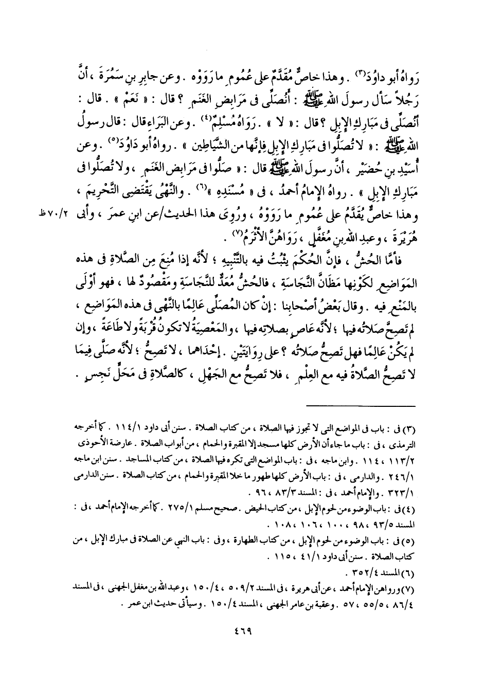 رَواهُ أبو داوُدَ (٣). وهذا خاصٌّ مُقَدَّمٌ على عُمُومِ ما رَوَوْه. وعن جابِرِ بنِ سَمُرَةَ، أنَّ رَجُلًا سَأل رسولَ اللهِ -صلى اللَّه عليه وسلم-: أَنُصَلِّى في مَرَابِضِ الغَنَمِ؟ قال: "نَعَمْ". قال: أَنُصَلِّى في مَبَارِكِ الإِبِلِ؟ قال: "لا". رَوَاهُ مُسْلِمٌ (٤). وعن البَرَاءِ قال: قال رسولُ اللهِ -صلى اللَّه عليه وسلم-: "لا تُصَلُّوا في مَبَارِكِ الإِبِلِ فإِنَّها من الشَّيَاطِين". رواهُ أبو دَاوُدَ (٥). وعن أُسَيْدِ بنِ حُضَيْر، أنَّ رسولَ اللهِ -صلى اللَّه عليه وسلم- قال: "صَلُّوا في مَرَابِض الغَنَمِ، ولا تُصَلُّوا في مَبَارِكِ الإبِلِ". رواهُ الإِمامُ أحمدُ، في"مُسْنَدِهِ" (٦). والنَّهْيُ يَقْتَضِى التَّحْرِيمَ، وهذا خاصٌّ يُقَدَّمُ على عُمُومِ ما رَوَوْهُ، ورُوِىَ هذا الحديث عن ابنِ عمرَ، وأبى هُرَيْرَةَ، وعبدِ اللهِ بنِ مُغَفَّلٍ، رَوَاهُنَّ الأثْرَمُ (٧).
