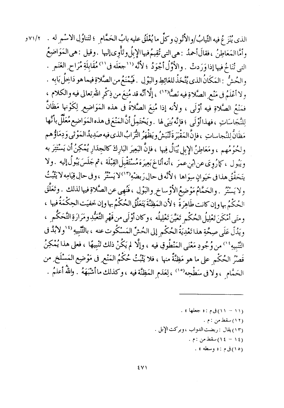 الذي يُنْزَعُ فيه الثِّيابُ والأتُونِ وكلِّ ما يُغْلَقُ عليه بابُ الحَمَّامِ؛ لتَناوُلِ الاسْمِ له. وأمَّا المَعَاطِنُ، فقالَ أحمدُ: هي التي تُقِيمُ فيها الإِبِلُ وتَأْوِى إليها. وقيل: هي المَوَاضِعُ التي تُنَاخُ فيها إذا وَرَدتْ. والأوَّلُ أجْوَدُ؛ لأنَّه [جعَلَه في] (١١) مُقَابِلَةِ مُرَاحِ الغَنَمِ. والحُشُّ: المَكَانُ الذي يُتَّخَذُ للغَائِطِ والبَوْلِ. فَيُمْنَعُ من الصَّلاةِ فيما هو دَاخِلُ بَابِه. ولا أعْلَمُ في مَنْعِ الصَّلاةِ فيه نَصًّا (١٢)، إلَّا أنَّه قد مُنِعَ من ذِكْرِ اللهِ تعالى فيه والكلام، فمَنْعُ الصَّلاةِ فيه أوْلَى، ولأنه إذا مُنِعَ الصَّلاةُ في هذه المَوَاضِعِ لِكَوْنها مَظَانَّ لِلنَّجَاسَاتِ، فهذا أوْلَى؛ فإنَّه بُنِىَ لها. ويَحْتَمِلُ أنَّ المَنْعَ في هذه المَوَاضِع مُعَلَّلٌ بأنَّها مَظَانُّ لِلنَّجاساتِ، فإنَّ المَقْبَرَةَ تُنْبَشُ ويَظْهَرُ التُّرَابُ الذي فيه صَدِيدُ المَوْتَى وَدِمَاؤُهم ولُحُومُهم، ومَعَاطِنُ الإِبِلِ يُبَالُ فِيها، فإنَّ البَعِيرَ البَارِكَ كالجِدَارِ يُمْكِنُ أن يَسْتَتِرَ به ويَبُول، كما رُوِىَ عن ابْنِ عمرَ، أنه أنَاخَ بَعِيرَه مُسْتَقْبِلَ القِبْلَة، ثم جَلَسَ يَبُولُ إليه. ولا يتَحَقَّقُ هذا في حَيَوانٍ سِوَاها؛ لأنَّه في حالِ رَبضْهِ (١٣) لا يَسْتُرُ، وفي حالِ قِيَامِه لا يَثْبُتُ ولا يَسْتُرُ. والحَمَّامُ مَوْضِعُ الأوْساخِ والبَوْلِ، فَنُهِى عن الصَّلاةِ فيها لذلك. وتَعَلَّقَ الحُكْمُ بها وإن كانت طَاهِرَةً؛ لأن المَظِنَّةَ يَتَعَلَّقُ الحُكْمُ بها وإن خَفيَت الحِكْمَةُ فيها، ومتَى أمْكَنَ تَعْلِيلُ الحُكْمِ تَعَيَّنَ تَعْلِيلُه، وكان أوْلَى من قَهْرِ التَّعَبُّدِ ومَرَارَةِ التَّحَكُّمِ، ويَدُلّ عَلَى صِحَّةِ هذا تَعْدِيَةُ الحُكْمِ إلى الحُشِّ المَسْكُوت عنه، بالتَّنْبِيهِ [ولا بُدَّ في التَّنْبِيهِ] (١٤) من وُجُودِ مَعْنَى المَنْطُوقِ فيه، وإلَّا لم يَكُنْ ذلك تَنْبِيهًا، فعلى هذا يُمْكِنُ قَصْرُ الحُكْمِ على ما هو مَظِنَّةٌ منها، فلا يَثْبُتُ حُكْمُ المَنْعِ في مَوْضِع المَسْلَخِ من الحَمَّامِ، ولا في سَطْحِه (١٥)، لِعَدَمِ المَظِنَّة فيه، وكذلك ما أشْبَهَهُ. واللهُ أعلمُ.