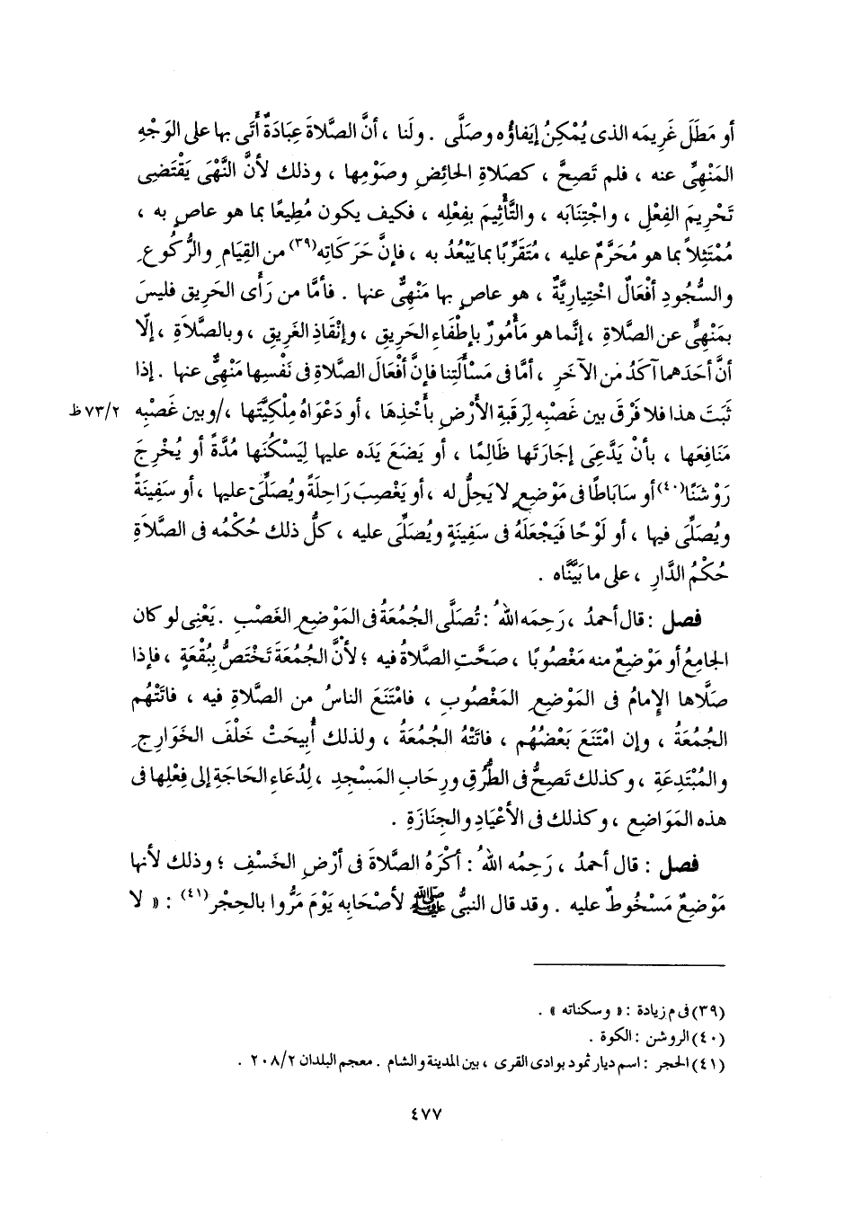 فصل: قال أحمدُ، رَحِمهُ اللهُ: أكْرَهُ الصَّلاةَ في أرْضِ الخَسْفِ؛ وذلك لأنها مَوْضِعٌ مَسْخُوطٌ عليه. وقد قال النبيُّ -صلى اللَّه عليه وسلم- لأصْحَابِه يَوْمَ مَرُّوا بالحِجْر (٤١): "لا