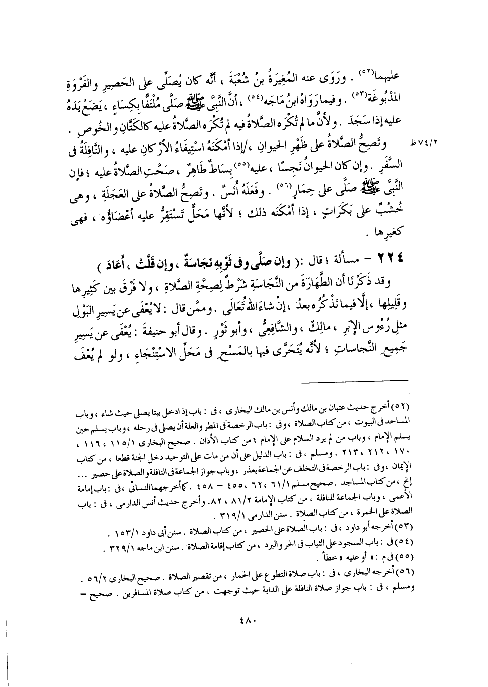 (٥٦) أخرجه البخاري، في: باب صلاة التطوع على الحمار، من تقصير الصلاة. صحيح البخاري ٢/ ٥٦. ومسلم، في: باب جواز صلاة النافلة على الدابة حيث توجهت، من كتاب صلاة المسافرين. صحيح =