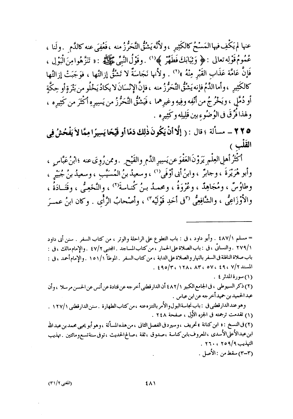 عنها لم يَكْفِ فيها المَسْحُ كالكَثِيرِ، ولأنَّه يَشُقُّ التَّحَرُّزُ منه، فَعُفِىَ عنه كالدَّمِ. ولَنا، عُمُومُ قَوْلِه تعالى: {وَثِيَابَكَ فَطَهِّرْ} (١). وقَوْلُ النَّبِيِّ -صلى اللَّه عليه وسلم-: "تَنَزَّهُوا مِنَ الْبَوْلِ، فَإنَّ عَامَّة عَذَابِ القَبْرِ مِنْهُ" (٢). ولأنها نَجَاسَةٌ لا تَشُقُّ إزالتُها، فوَجَبَتْ إزالتُها كالكَثِيرِ، وأما الدَّمُ فإنه يَشُقُّ التَّحَرُّزُ منه، فإنَّ الإِنْسَانَ لا يكادُ يَخْلُو من بَثْرَةٍ أو حِكَّةٍ أو دُمَّلٍ، ويَخْرُجُ من أنْفِه وفِيهِ وغيرِهما، فَيَشُقُّ التَّحَرُّزُ من يَسِيرِهِ أكْثَرَ من كَثِيرِه، ولهذا فُرِّقَ في الوُضُوءِ بين قَلِيلِه وكَثِيرِه.