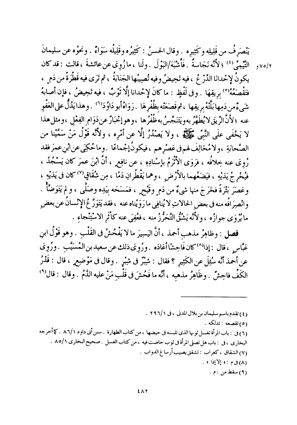يَنْصَرِفُ من قَلِيلِه وكَثِيرِه. وقال الحسنُ: كَثِيرُه وقَلِيلُه سَوَاءٌ. ونحوُه عن سليمانَ التَّيْمِىِّ (٤)؛ لأنَّه نَجَاسةٌ. فَأَشْبَهَ البَوْلَ. ولَنا، ما رُوِىَ عن عائشةَ، قالت: قد كان يكونُ لإِحْدانَا الدِّرْعُ، فيه تَحِيضُ وفيه تُصِيبُها الجَنَابَةُ، ثم تَرَى فيه قَطْرَةً من دَمٍ، فتَقْصَعُهُ (٥) بِرِيقِهَا. وفي لَفْظٍ: ما كانَ لإِحْدانا إلَّا ثَوْبٌ، فيه تَحِيضُ، فإن أصابهُ شَىءٌ من دَمِها بَلَّتْهُ بِرِيقِها، ثم قَصَعَتْه بِظُفْرِهَا. رَوَاهُ أبو دَاوُدَ (٦). وهذا يَدُلُّ على العَفْوِ عنه؛ لأنَّ الرِّيقَ لا يُطَهَّرُ به ويَتَنَجَّسُ به ظُفْرُها، وهو إخْبَارٌ عن دَوَامِ الفِعْلِ، ومثل هذا لا يَخْفَى علَى النَّبِيِّ -صلى اللَّه عليه وسلم-، ولا يَصْدُرُ إلَّا عن أمْرِه، ولأنَّه قَوْلُ مَنْ سَمَّيْنا من الصَّحابَةِ، ولا مُخَالِفَ لهم في عَصْرِهم، فيكونُ إجْماعًا. وما حُكِىَ عن ابْنِ عمرَ فقد رُوِىَ عنه خِلافُه، فرَوَى الأثْرَمُ بإسْنادِهِ، عن نافِعٍ، أنَّ ابْنَ عمرَ كان يَسْجُدُ، فيُخْرِجُ يَدَيْهِ، فيَضَعُهما بالأرْضِ، وهما يَقْطُرانِ دَمًا، مِن شُقَاقٍ (٧) كان في يَدَيْهِ، وعَصَرَ بَثْرَةً فخَرَجَ منها شيءٌ من دَمِ وقَيْحٍ، فمَسَحَه بِيَدِه وصَلَّى، ولم يَتَوَضَّأْ. وانْصِرَافُه منه في بعضِ الحالاتِ لا يُنافِى ما رَوَيْناه عنه، فقد يَتَوَرَّعُ الإِنْسان عن بعضِ ما يُرْوَى جوازُه، ولأنَّه يَشُقُ التَّحَرُّزُ منه، فعُفِىَ عنه كأثَرِ الاسْتِنْجاءِ.