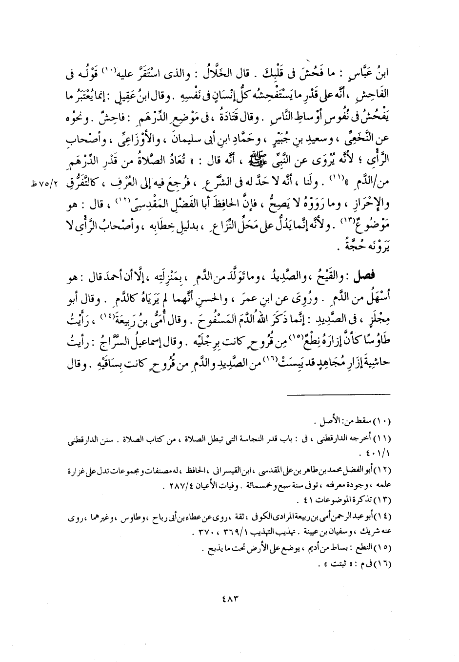 فصل: والقَيْحُ، والصَّدِيدُ، وما تَوَلَّدَ من الدَّم، بِمَنْزِلَتِه، إلَّا أن أحمدَ قال: هو أسْهَلُ من الدَّمِ. ورُوِىَ عن ابنِ عمرَ، والحسنِ أنَّهما لم يَرَيَاهُ كالدَّمِ. وقال أبو مِجْلَزٍ، في الصَّدِيدِ: إنَّما ذَكَرَ اللهُ الدَّمَ اْلمَسْفُوحَ. وقال أُمَيُّ بنُ رَبِيعَةَ (١٤)، رَأَيْتُ طَاوُسًا كأنَّ إزارَهُ نِطْعٌ (١٥) مِن قُرُوحٍ كانت بِرِجْلَيْه. وقال إسماعيلُ السَّرَّاجُ: رَأيتُ حاشِيةَ إزَارِ مُجَاهِدٍ قد يَبِسَتْ (١٦) من الصَّدِيدِ والدَّمِ من قُرُوحٍ كانت بِسَاقَيْهِ. وقال